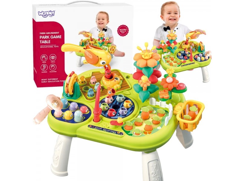 Interaktywny multistolik edukacyjny od marki WOOPIE to wyjątkowy zestaw gier i zabawek, który zapewnia nie tylko rozrywkę, ale także rozwój umiejętności Twojego dziecka. Stolik dzięki swojej wielofunkcyjności pozwala dziecku na różnorodną zabawę i gwarantuje, że zabawka nie będzie się nudzić, ponieważ ma do zaoferowania wiele aktywności: łowienie rybek, wbijania robaczków młoteczkiem, zabawy w ogród czy zabawy z dzięciołem w wyciąganie robaczka. Te wszystkie zabawy pozwalają dziecku na spokoje oswajanie się z powierzonymi mu zadaniami, uczą cierpliwości oraz usprawniają rączki. Dziecko podczas zabawy wycisza się oraz pracuje nad swoją małą motoryką. Zabawka zapewnia interaktywną i angażującą zabawę, która rozwija wyobraźnię, spostrzegawczość i umiejętności interpersonalne dziecka, umożliwiając mu eksplorowanie świata wokół siebie.