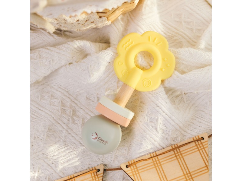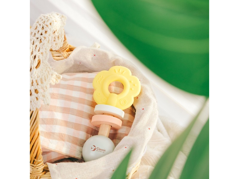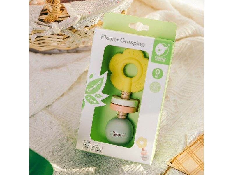 Urocza grzechotka w kształcie kwiatka zaprojektowana została z myślą o najmłodszych dzieciach. Delikatne, pastelowe kolory przyciągają uwagę maluszka, a przyjemna w dotyku powierzchnia i odpowiedni rozmiar sprawiają, że łatwo ją chwycić i potrząsać. Zabawka została stworzona z bezpiecznych materiałów – drewna i silikonu – dzięki czemu nadaje się dla dzieci już od pierwszych dni życia.