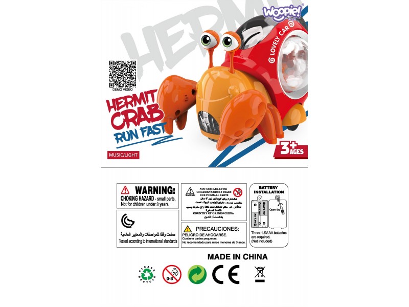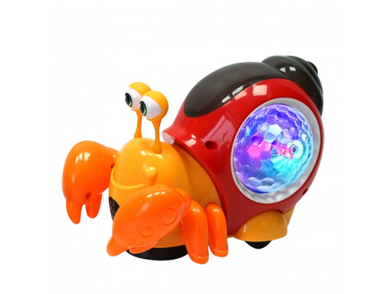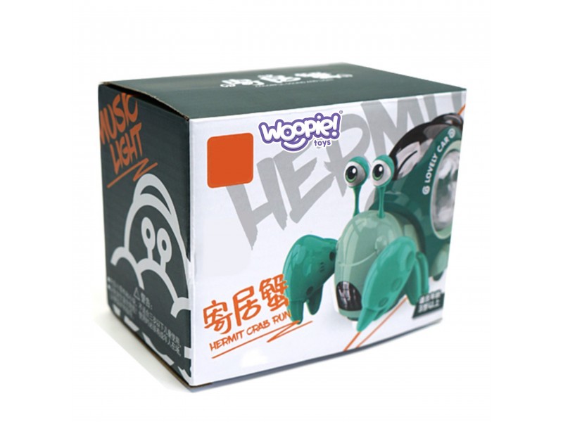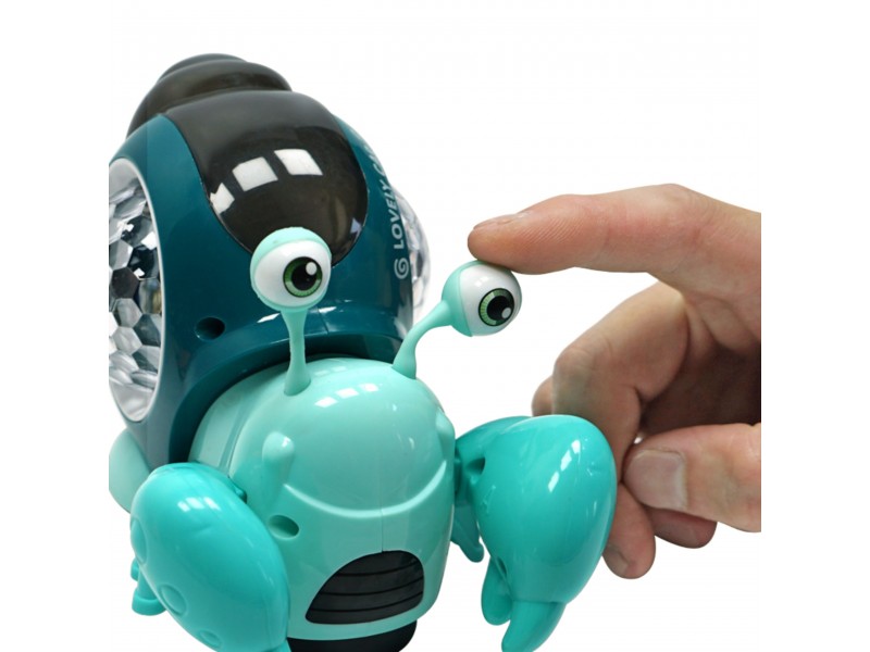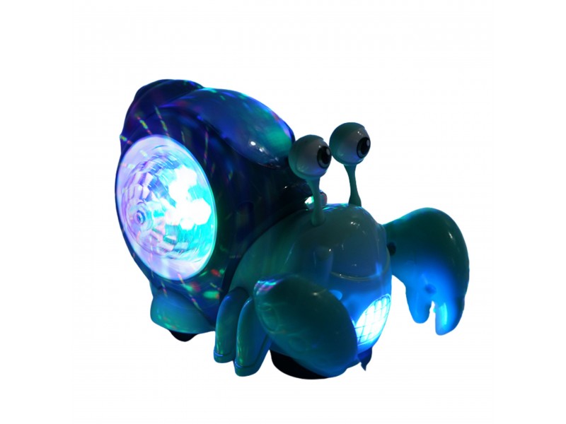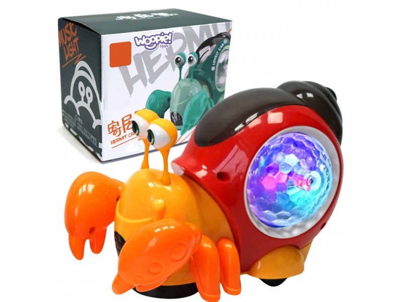 - Po zdjęciu dolnej osłonki przy kółkach kraba, zaczyna on jeździć. Gdy zabawka napotyka przeszkodę zaczyna pełznąć w innym kierunku. Całej zabawie towarzyszy wesoła muzyka i kolorowe światełka z muszli kraba.