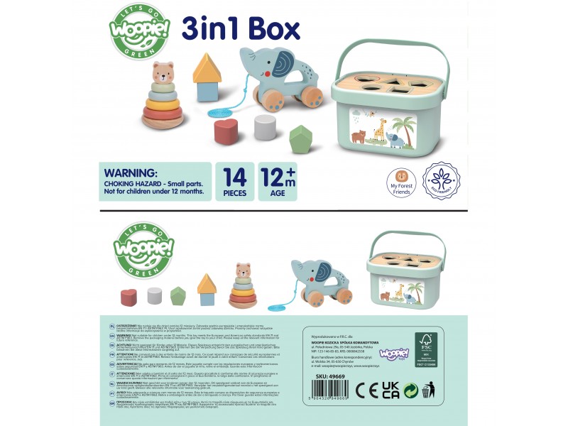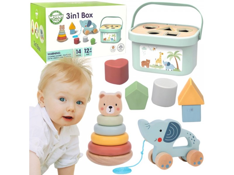 Pudełko z zabawkami 3w1 firmy Tooky Toy to klasyczny zestaw zabawek, który zawiera 5 klocków o różnych kształtach i kolorach, misia piramidkę do układania, słonika do pchania i ciągnięcia oraz plastikowe pudełko do przechowywania. Pudełko ma pięć otworów o różnych kolorowych kształtach, które pozwalają dzieciom ćwiczyć rozpoznawanie kształtów i umiejętność sortowania kształtów do odpowiednich otworów. Piramidka miś składa się z 4 kolorowych krążków oraz głowy misia umieszczone na balansującej drewnianej podstawie, pozwala dzieciom układać krążki według wielkości i doskonalić swoje umiejętności motoryczne. Słonik do pchania i ciągnięcia to uroczy dodatek do zestawu, dzięki niemu dziecko ćwiczy chodzenie i równowagę. Wszystkie zabawki z zestawu mieszczą się w pudełku z uchwytem do przenoszenia, co ułatwia przechowywanie i transport.