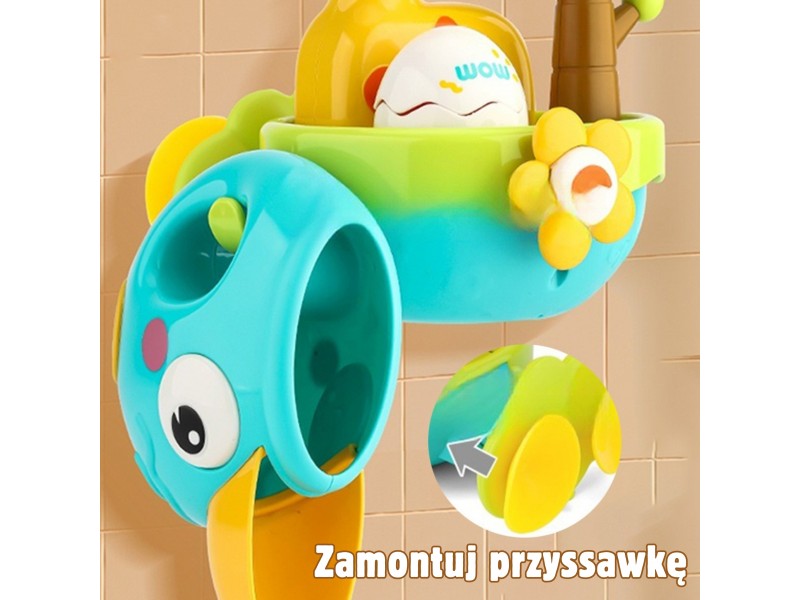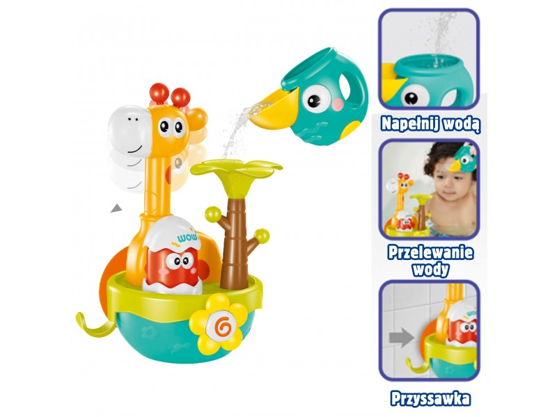Zmień codzienną kąpiel w fascynującą przygodę z zabawką do kąpieli Żyrafa! Ta urocza zabawka to gwarancja, że Twoje dziecko nie będzie płakać pod prysznicem. Żyrafa mocuje się do wanny za pomocą przyssawki i służy do przelewania wody. W zestawie znajduje się lejek w kształcie kaczuszki, którym dziecko może napełniać zbiornik żyrafy. Po wlaniu wody uruchamia się efekt wodospadu, a z czerwonej postaci w skorupce wysuwa się głowa , co zapewnia dodatkową frajdę. Zabawka jest łatwa do przechowywania dzięki wbudowanemu uchwytowi/haczykowi, co pomaga w kształtowaniu dobrych nawyków porządkowych.