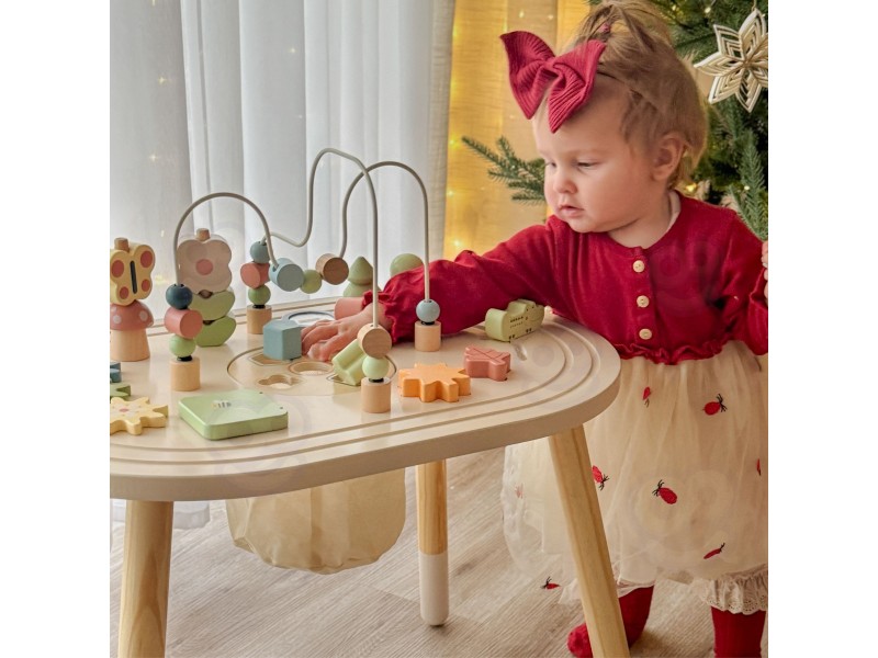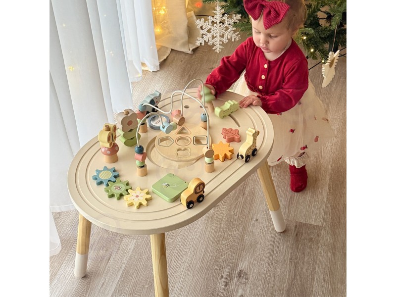 - - Stolik łączy w sobie : sorter kształtów, tor do przesuwania elementów oraz inne aktywności, zapewniając kompleksowy -rozwój