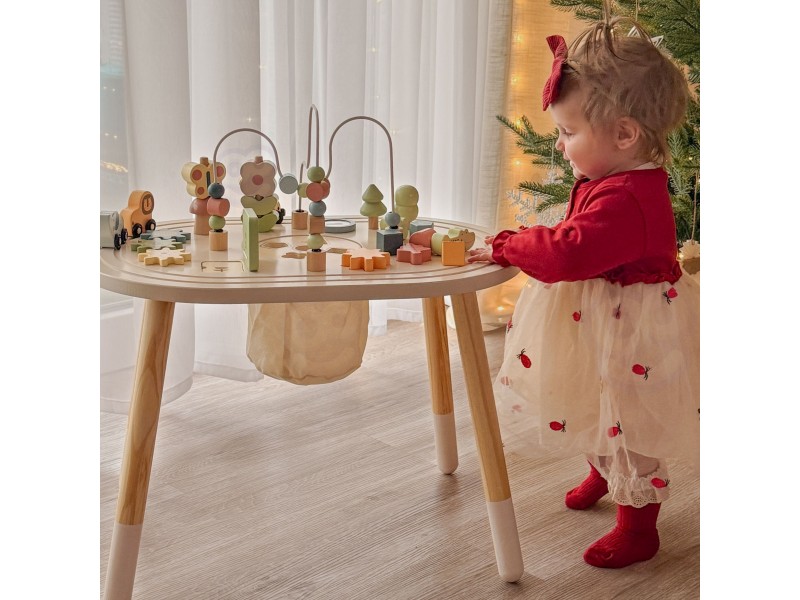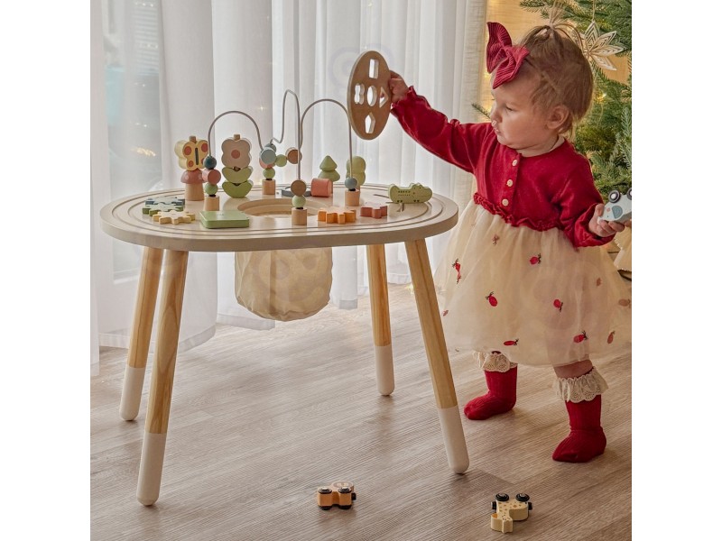 - - Koncentracja i samodzielność: Stolik zachęca do samodzielnej zabawy, ucząc dziecko skupienia uwagi na wykonywanych czynnościach.
