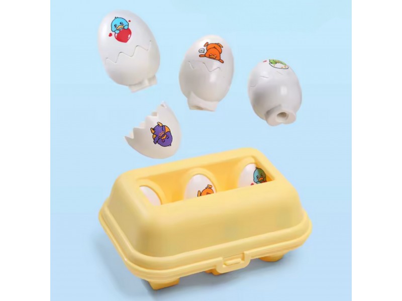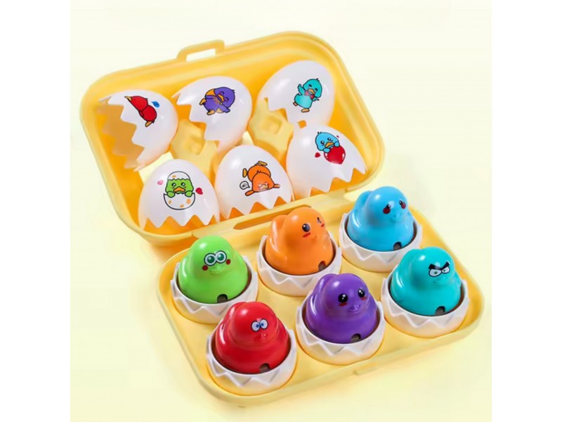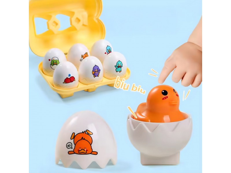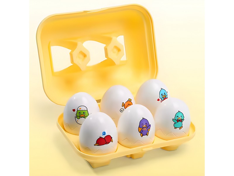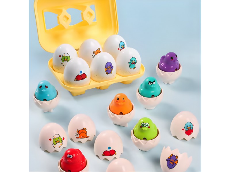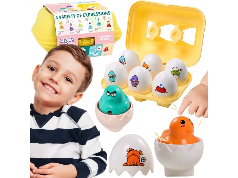Białe jajka edukacyjne z kolorowymi naklejkami od marki Woopie wprowadzą Twoje dziecko w świat pełen kolorów, kształtów i zabawnych minek. Każde z sześciu uroczych jajeczek skrywa w środku kolorowego pisklaka z inną, śmieszną minką , po naciśnięciu na którego usłyszymy efekt dźwiękowy. Zadaniem malucha jest nie tylko dopasowanie odpowiedniej skorupki do jajka, ale przede wszystkim dopasowanie go do odpowiedniego miejsca w wytłaczance. Każde jajko ma na spodzie unikalny kształt geometryczny, który odpowiada jednemu otworowi w pudełku. Zabawne minki to świetny sposób, aby nauczyć dzieci rozpoznawania i nazywania emocji. Dzięki nim maluchy w łatwy i przyjemny sposób przyswajają, jak wyglądają i co oznaczają różne uczucia.To fantastyczny trening logicznego myślenia i koordynacji!