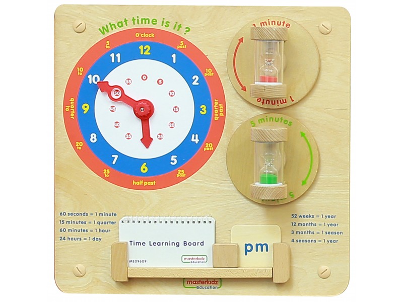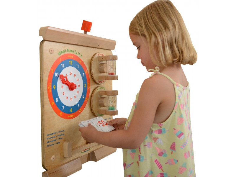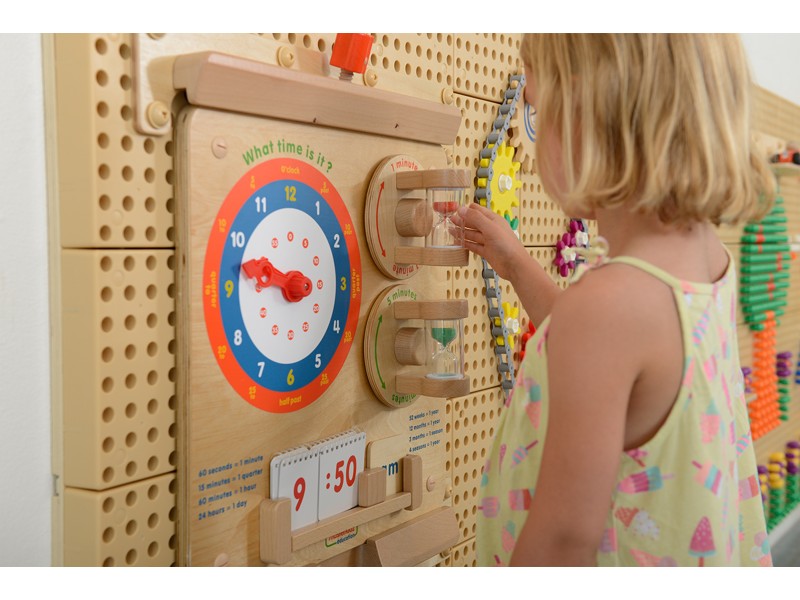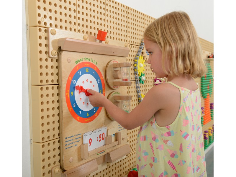 Zabawka służy do nauki odczytywania godzin z klasycznych zegarków. Na tablicy znajduje się tarcza zegarowa ze wskazówkami, które dziecko może dowolnie obracać. Wychowawca może dyktować godziny, a dziecko ma wtedy za zadanie ustawienie wskazówek w taki sposób, by zegar wskazywał podyktowaną godzinę. Dziecko może również bawić się samodzielnie, ponieważ w zestawie znajduje się zeszycik z różnymi godzinami. Dziecko przewraca kartki i ustawia godziny, które się tam znajdują.