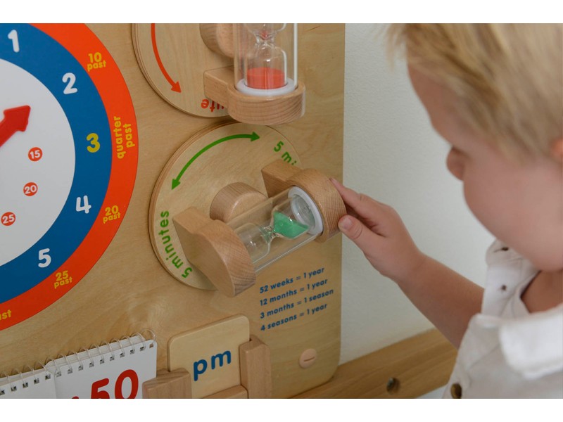 Kolejnym elementem zabawki są dwie klepsydry, dzięki którym maluch może uzmysłowić sobie jak długo trwa minuta, oraz 5 minut.