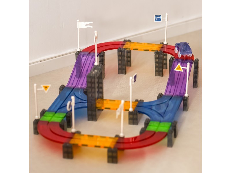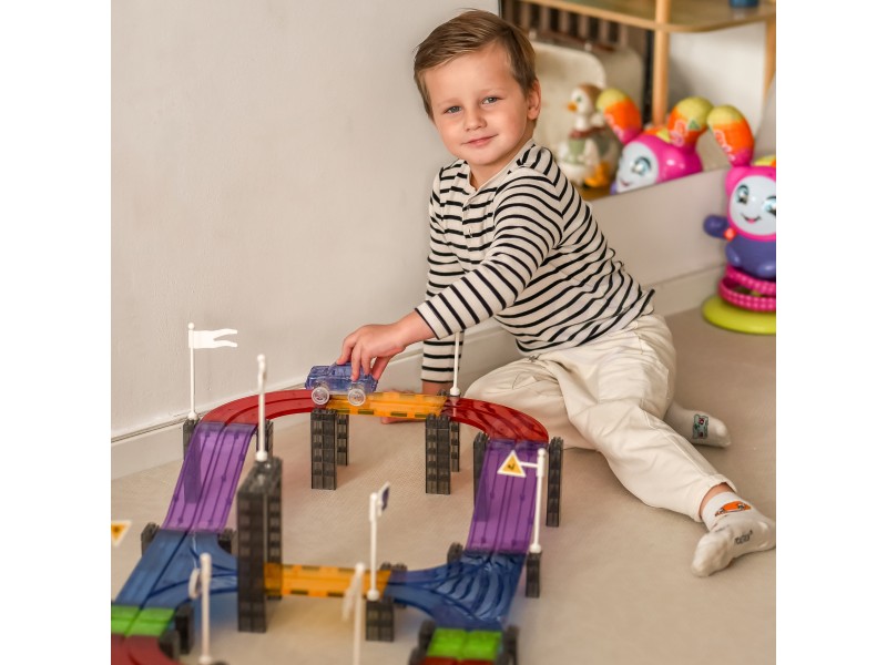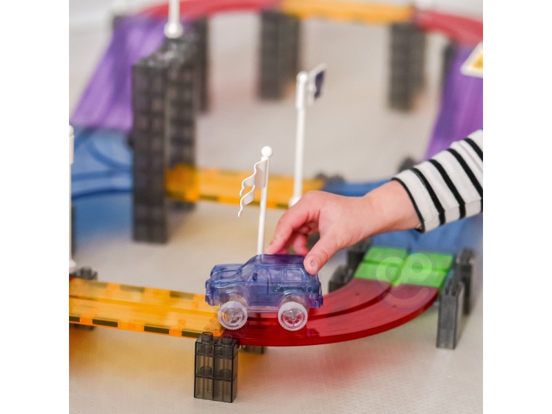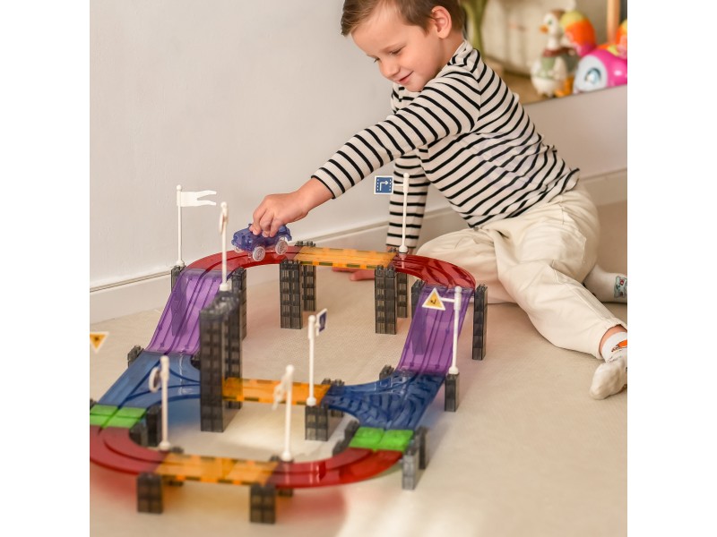 Magnetyczny Tor Wyścigowy marki Woopie to wyjątkowa zabawka, która rozbudzi kreatywność każdego dziecka i zamieni zabawę w niesamowitą przygodę pełną świateł i kolorów! Dzięki łatwym do łączenia magnetycznym elementom maluchy mogą samodzielnie budować różnorodne, wielopoziomowe tory, po których porusza się świecące autko. Przezroczyste, barwne części i efektowne światła LED sprawiają, że zabawa przyciąga uwagę oraz daje mnóstwo radości zarówno w dzień, jak i wieczorem.