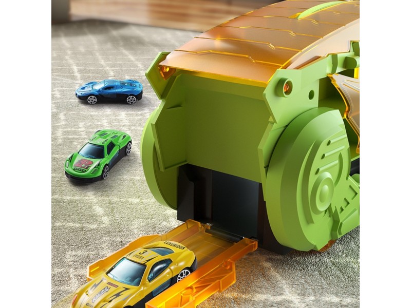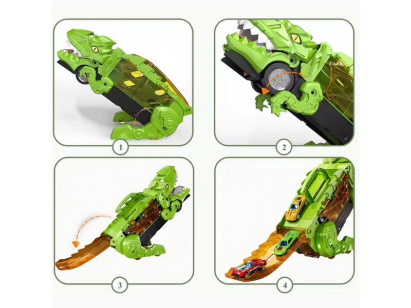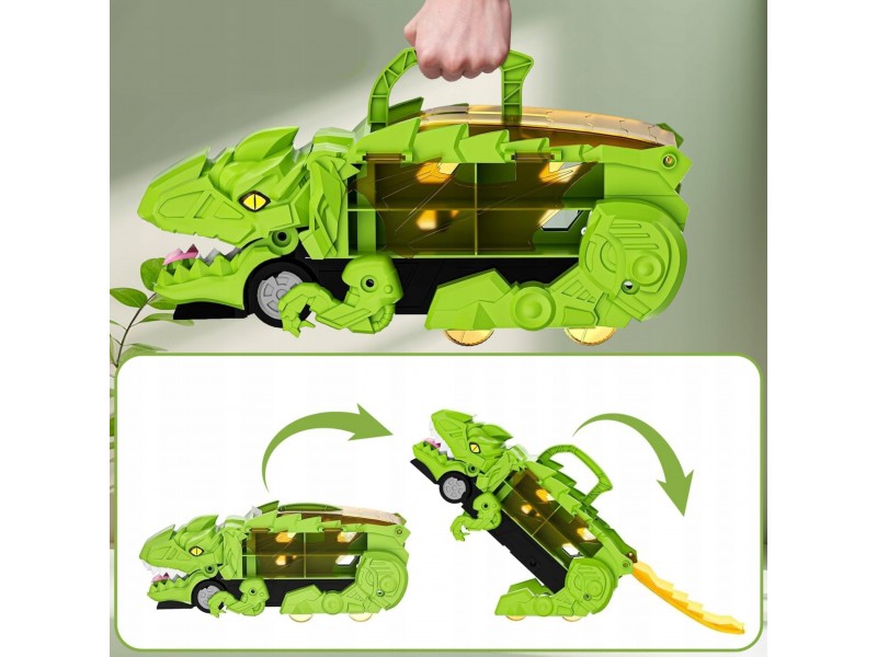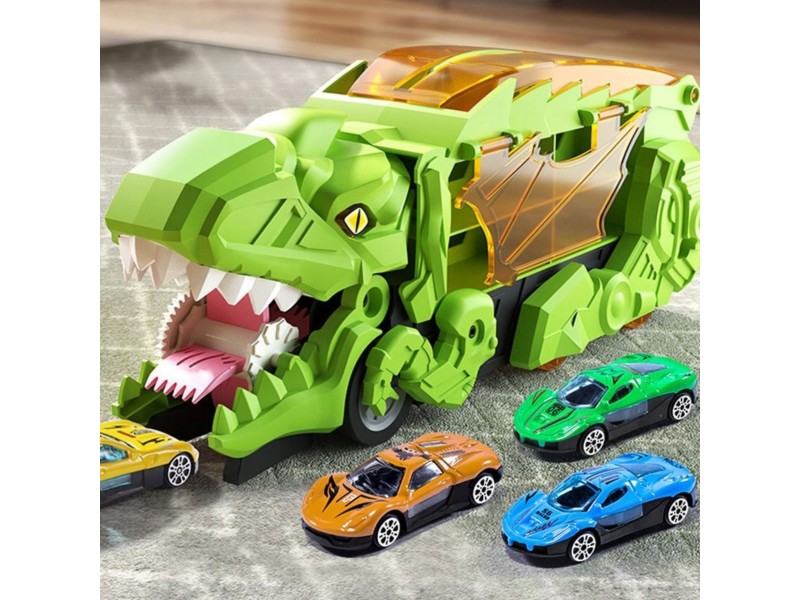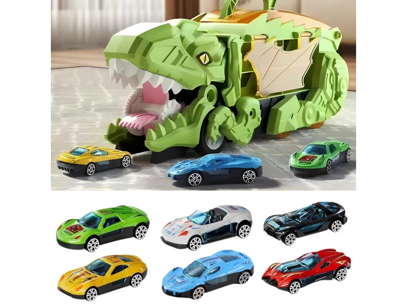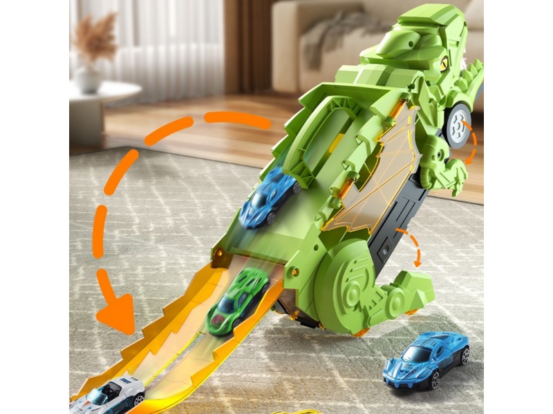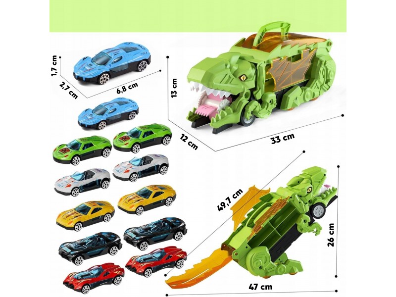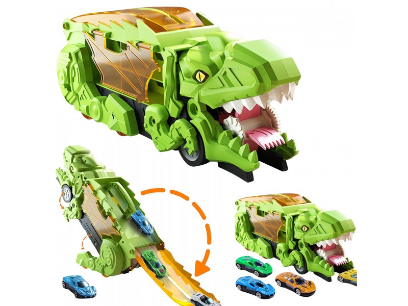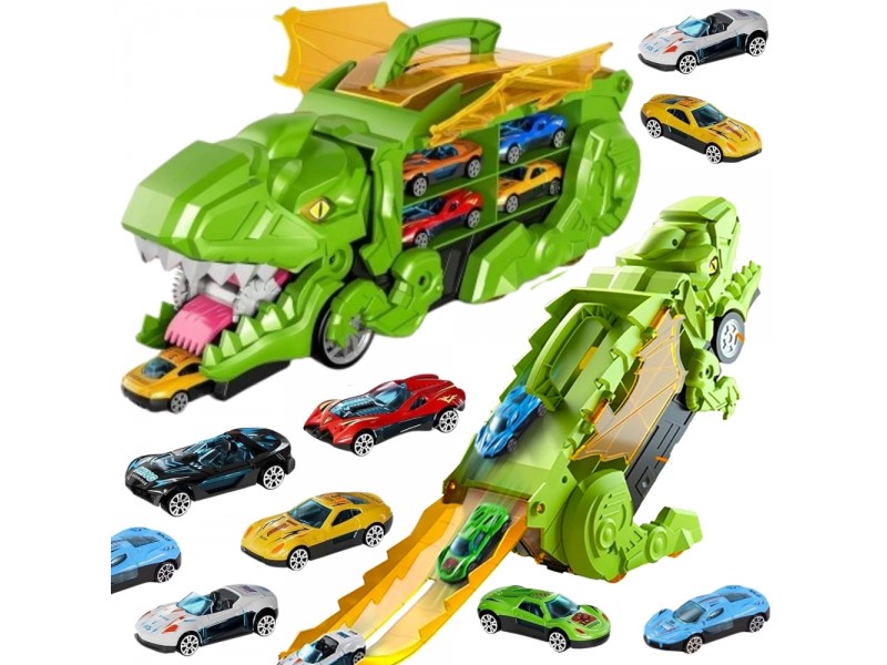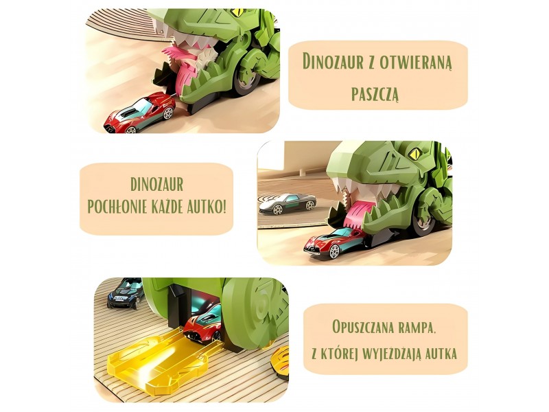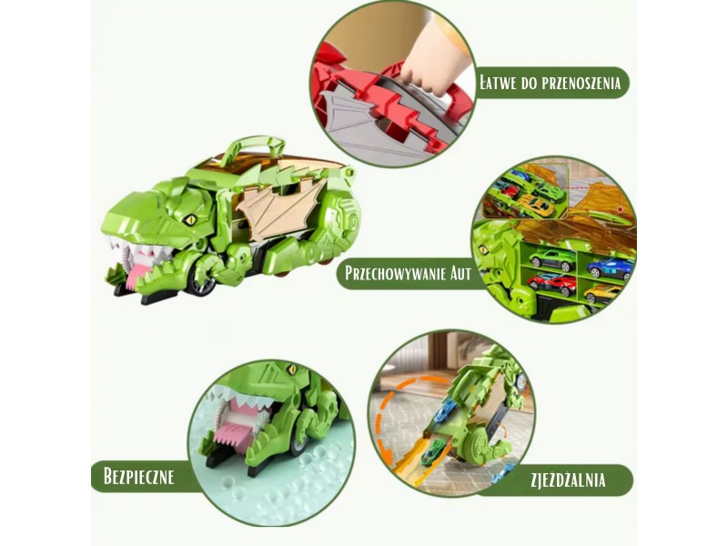 Zanurz się w fascynującym świecie prehistorycznych przygód i motoryzacyjnej zabawy! Ten niesamowity Dinozaur Pożeracz z autkami to prawdziwa gratka dla każdego małego miłośnika pojazdów i prehistorycznych stworzeń. Walizka z uchwytem w formie dinozaura nie tylko mieści cały zestaw w środku, ale pełni także funkcję interaktywnej zjeżdżalni. Po rozłożeniu zabawka zmienia się w tory wyścigowe, po których mogą pędzić dołączone samochodziki. Zestaw zawiera aż 6 pojazdów, dzięki czemu zabawa może trwać godzinami – solo lub z przyjaciółmi! Ruchome elementy, takie jak otwierana paszcza czy opuszczana rampa, wprowadzają dodatkowy wymiar interaktywności, rozwijając przy tym zdolności manualne i wyobraźnię dziecka. Całość wykonana została z solidnego, bezpiecznego tworzywa, odpornego na intensywną zabawę. Dzięki możliwości składania i wygodnej rączce, zestaw świetnie sprawdzi się zarówno w domu, jak i w podróży. To idealna zabawka dla dzieci kochających pojazdy, dinozaury, a także kreatywne konstrukcje i dynamiczną rozgrywkę. Ten zestaw z pewnością stanie się ulubionym elementem dziecięcej kolekcji!