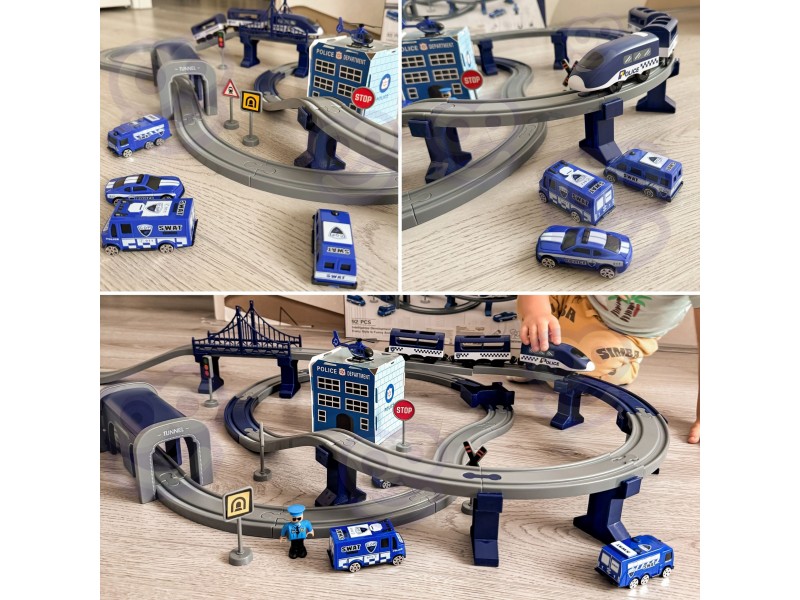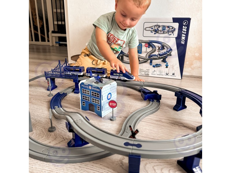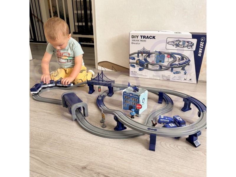 Kolejka Elektryczna Komisariat Policji od renomowanej marki Woopie to idealna propozycja dla naszych zmotoryzowanych dzieci. Kolorowa kolejka cieszy dzieci w każdym wieku, przysparza wielu atrakcji i nieskończonych emocji. Zestaw zawiera 92 elementy, w tym m.in. nowoczesną lokomotywę na baterie, solidne elementy toru, policyjne auta oraz helikopter. Zabawka ta, to jednak nie tylko mnóstwo radości, ale także ogromne możliwości rozwoju dla dziecka. Maluch uczy się podczas zabawy! Szczególnie rozwija się orientacja przestrzenna, zmysł techniczny oraz oczywiście wyobraźnię. Kolejka pakowana w oryginalne pudełko, idealnie nadające się na prezent.