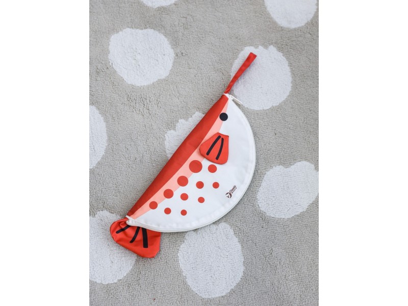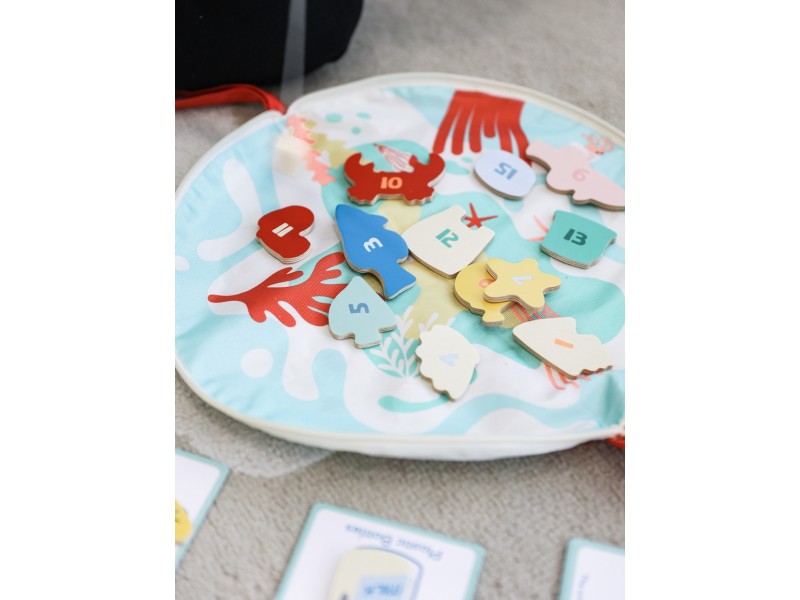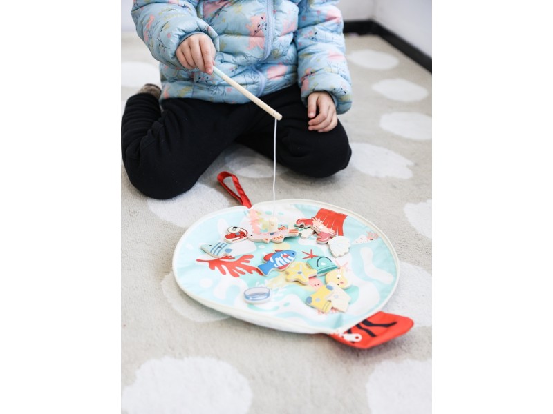 - - Zestaw zawiera matę do gry w kształcie ryby, która po złożeniu pełni funkcję praktycznego etui na elementy.