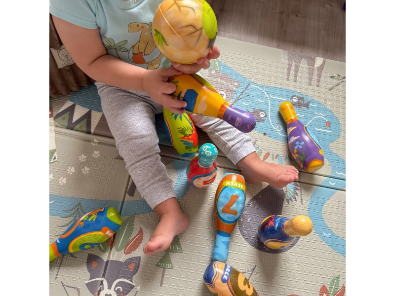 Zabierz swoje dziecko w podróż do świata prehistorycznych gigantów z Zestawem Do Kręgli Dinozaury od marki Woopie! To klasyczna gra w kręgle w nowej, fascynującej odsłonie, idealna dla dzieci od 3 roku życia. Zestaw składa się z 10 kolorowych kręgli i 2 piłek. Kręgle mają fantastyczne wzory przedstawiające różne sceny i postacie dinozaurów, co z pewnością przyciągnie uwagę każdego malucha. Kręgle są wykonane z lekkiego, bezpiecznego materiału, co czyni je idealnymi do zabawy w domu i ogrodzie. Gra rozwija sprawność fizyczną, koordynację ruchową oraz celność, a także uczy zdrowej rywalizacji i cierpliwości.
