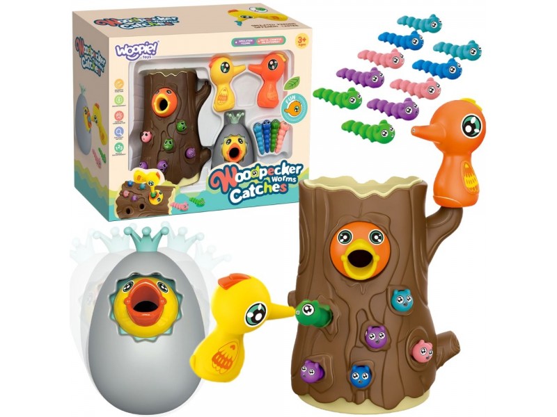 Gra Zręcznościowa Złap Robaczka od marki WOOPIE to doskonały sposób na wspólne spędzanie czasu z dzieckiem. Proste zasady oraz intuicyjna obsługa sprawiają, że zagrać w nią może praktycznie każdy. Zabawa polega na chwytaniu dzięciołem zakończonym magnesem robaczków ukrytych w otworkach znajdujących się w drzewie, a następnie na ich ponownym wkładaniu w dziób ptaszka. W zestawie oprócz mamy i taty dzięcioła do karmienia pisklaka, kłody z pisklakiem i 10 robaków, znajduję się jajko pisklak, który służyć może dodatkowo jako wańka wstańka do kołysania oraz skarbonka. Zestawem może się bawić jednocześnie dwoje dzieci. Gra uczy przez zabawę - pomoże rozwinąć m. in. umiejętności motoryczne (ruchowe) oraz wzrokowe. Zabawka jest sporym wyzwaniem dla malucha, wymaga skupienia uwagi oraz sprawności manualnej, ale przez to niezwykle zaciekawi dziecko.