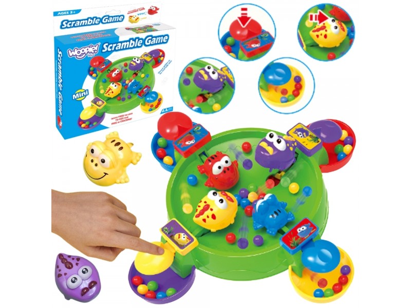 Gra GŁODNE WESOŁE ŻABKI I KROKODYLKI od marki WOOPIE to super gra dla każdego! Proste zasady - wystarczy jak najszybciej naciskać w guzik i zebrać jak najwięcej kuleczek. Gra wieloosobowa od 2 do 4 graczy. Pobudza rywalizację u dzieci. Można bawić się wszędzie!