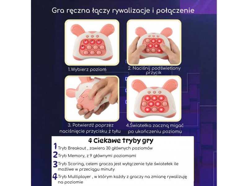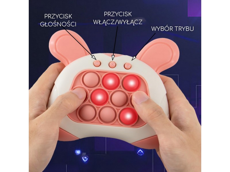 Gra POP IT Uszy Króliczka to zabawka antystresowa, która sprawdzi się już dla najmłodszych. Gra wydaje radosne dźwięki, które zachęcają dzieci do zabawy i urozmaicają rozgrywkę. Zabawka jest niewielka więc, sprawia, że możemy zabrać ją ze sobą. Pop It sprawia frajdę dzieciom oraz dorosłym, którzy chętnie po nią sięgają. Rozwija umysł,zdolności manualne, koordynację wzrokowo-ruchową oraz trenuje spostrzegawczość i pomaga w walce ze stresem.
