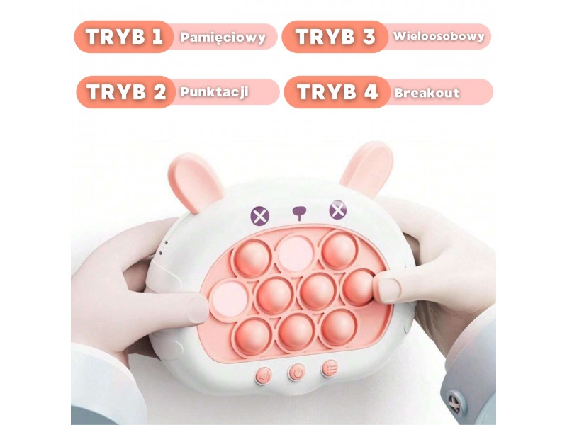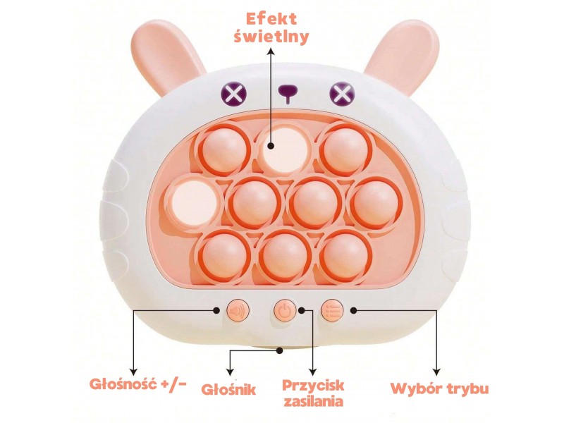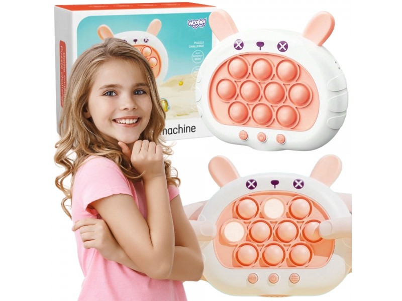 Gra POP IT Króliczek to zabawka antystresowa, która sprawdzi się już dla najmłodszych. Gra wydaje radosne dźwięki, które zachęcają dzieci do zabawy i urozmaicają rozgrywkę. Zabawka jest niewielka więc, sprawia, że możemy zabrać ją ze sobą. Pop It sprawia frajdę dzieciom oraz dorosłym, którzy chętnie po nią sięgają. Rozwija umysł, zdolności manualne, koordynację wzrokowo-ruchową oraz trenuje spostrzegawczość i pomaga w walce ze stresem.