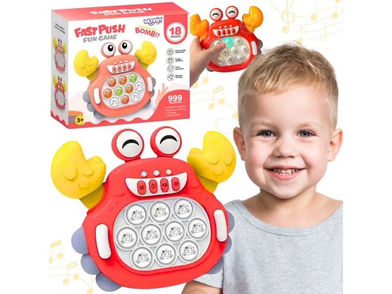 Gra POP IT Krab to zabawka antystresowa, która sprawdzi się już dla najmłodszych. Gra wydaje radosne dźwięki, które zachęcają dzieci do zabawy i urozmaicają rozgrywkę. Zabawka jest niewielka więc, sprawia, że możemy zabrać ją ze sobą. Pop It sprawia frajdę dzieciom oraz dorosłym, którzy chętnie po nią sięgają. Rozwija umysł, zdolności manualne, koordynację wzrokowo-ruchową oraz trenuje spostrzegawczość i pomaga w walce ze stresem.