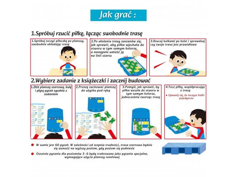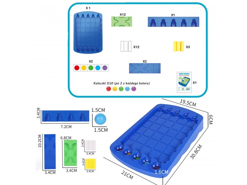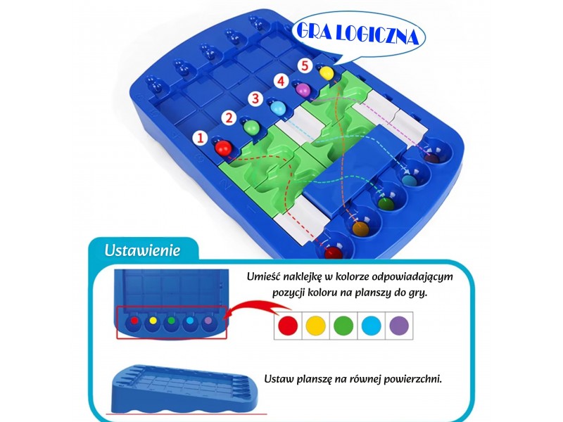 Gra Strategiczna od marki WOOPIE, to wspaniały pomysł na prezent dla twojego dziecka jeśli chcesz aby spędziło czas na rozwijającej, wspierającej rozwój grze. Proste zasady i rozgrywka, która angażuje mózg dziecka do myślenia, gwarantują godziny wspaniałej zabawy. Zasady są łatwe - każdy kolor kulki musi trafić do odpowiadającemu jej dołeczka. Nie jest to jednak takie łatwe, do gry dołączona jest książeczka z 60 zadaniami do wykonania podczas budowy różnych torów dla kuleczek.