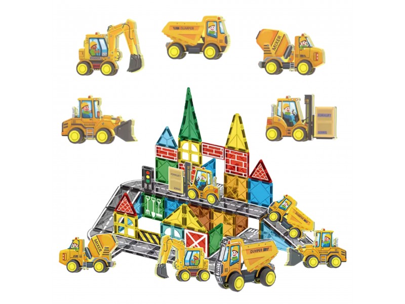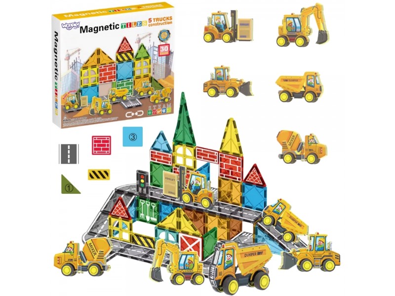 - - Zestaw konstrukcyjny z magnetycznymi klockami i pojazdami budowlanymi
