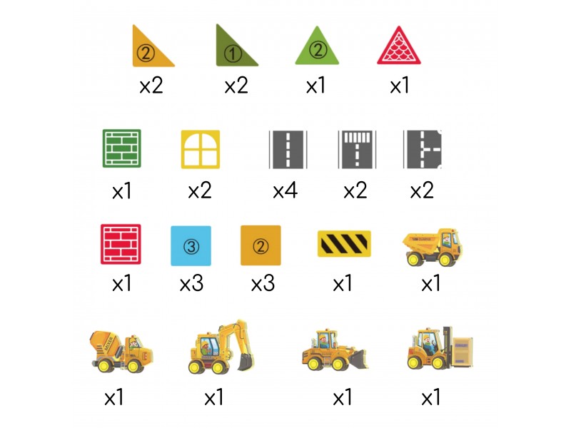 - - 5 × pojazdy budowlane (koparka, spychacz, betoniarka, wywrotka, ładowarka)