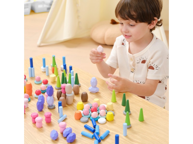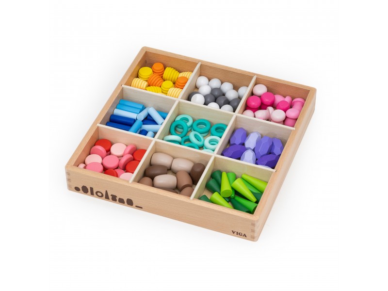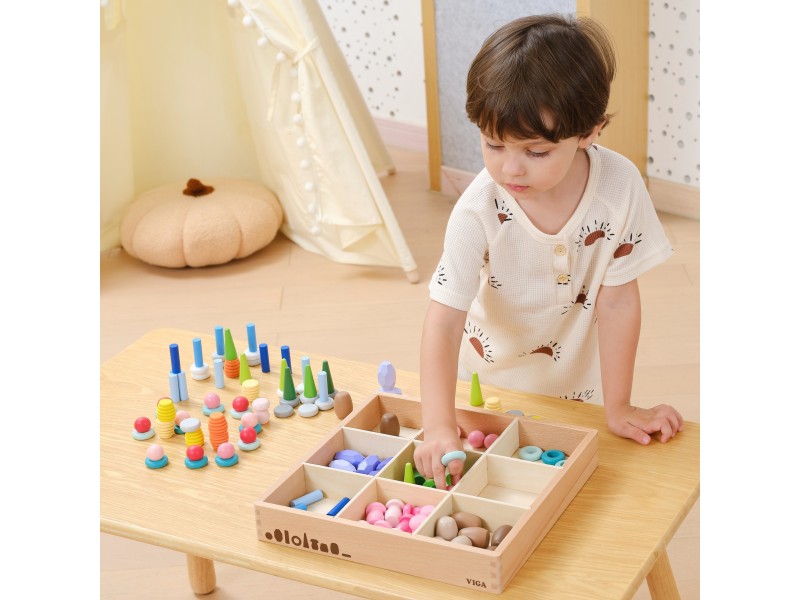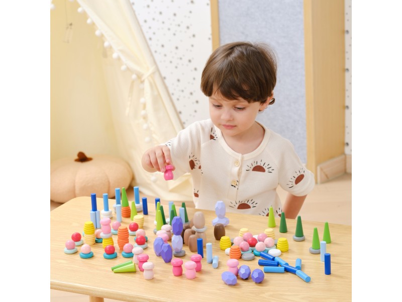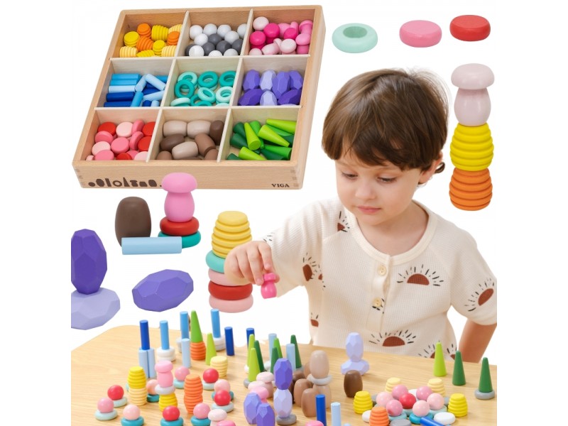 Klocki Nature Treasures VIGA to 141 luźnych elementów inspirowanych naturą – grzyby, plastry miodu, kamienie i stożki. Dzięki otwartej formie klocki nie narzucają zasad – dziecko może swobodnie sortować, budować i tworzyć własne historie. Zestaw wspiera rozwój manualny, koncentrację i wyobraźnię, będąc idealnym narzędziem do zabawy sensorycznej i artystycznej. To coś więcej niż zabawka – to inwestycja w rozwój Twojej pociechy!