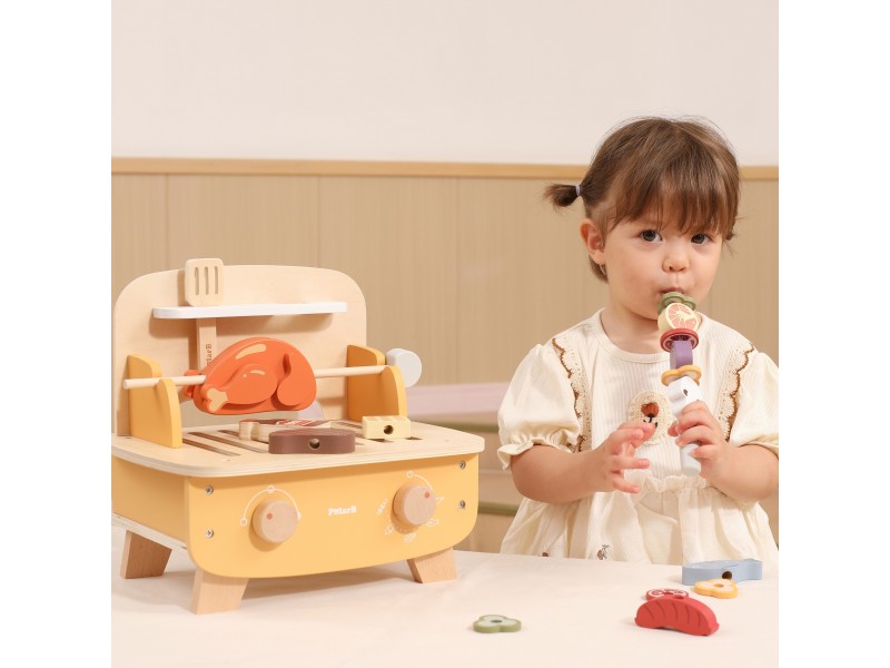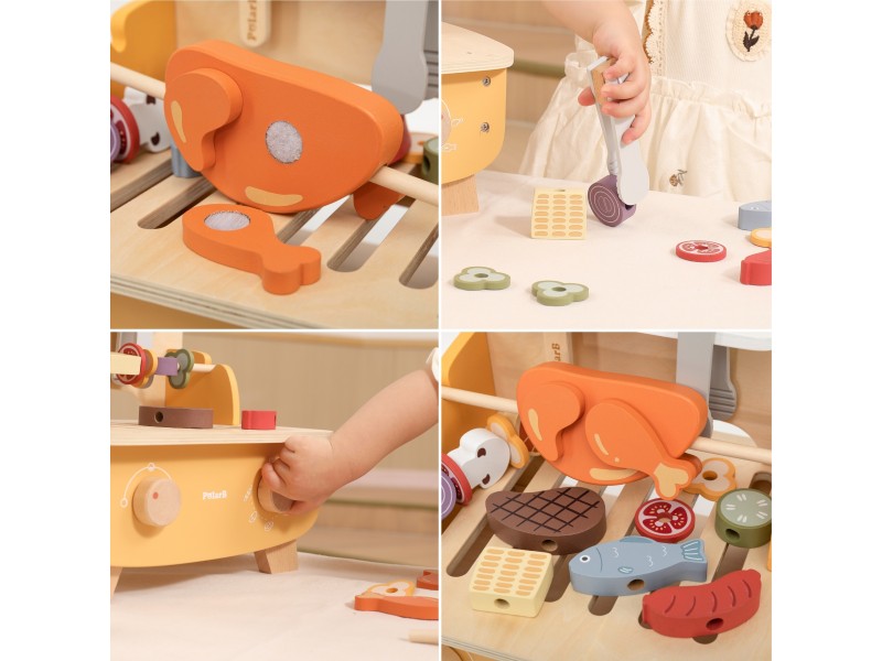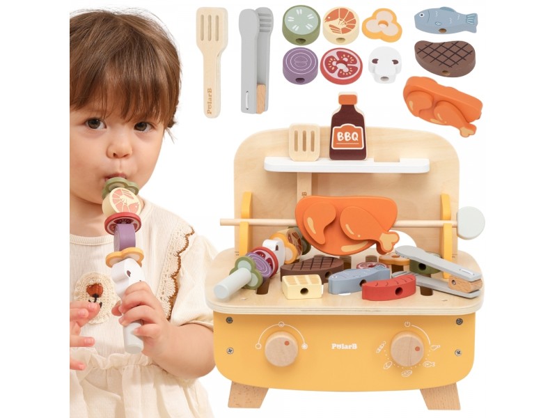 Rozpal wyobraźnię swojego malucha dzięki wyjątkowemu zestawowi do grillowania od marki VIGA ! Dzieci już od 18 miesiąca życia mogą wcielić się w rolę małych kucharzy i bawić się w grillowanie niczym dorośli. Szaszłyki do obracania, przyprawy do posypywania i realistyczne akcesoria sprawiają, że zabawa staje się niezwykle autentyczna. 22 elementy pozwalają na niekończone kombinacje smaków – od kurczaka, przez rybę, aż po kolorowe warzywa. To idealny sposób na rozwój kreatywności, zdolności manualnych i naukę rozpoznawania jedzenia w formie bezpiecznej, drewnianej zabawy.