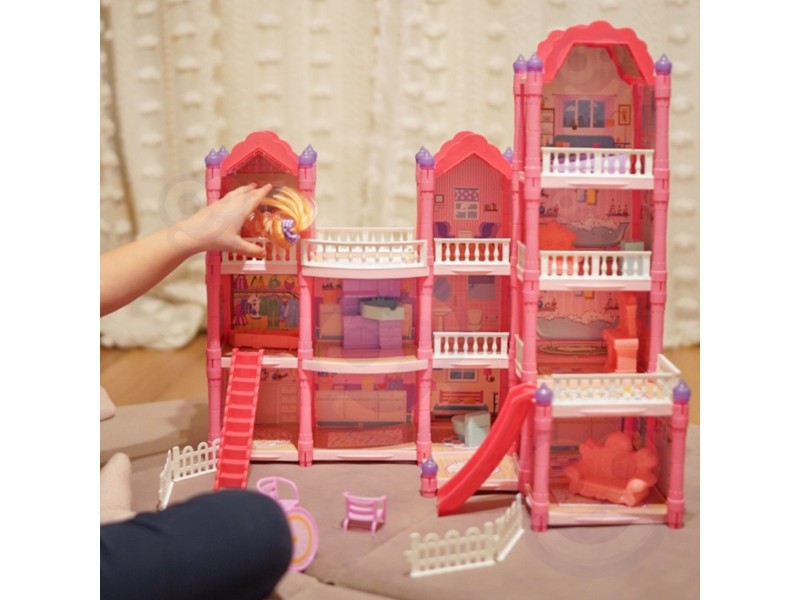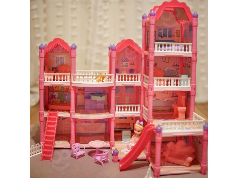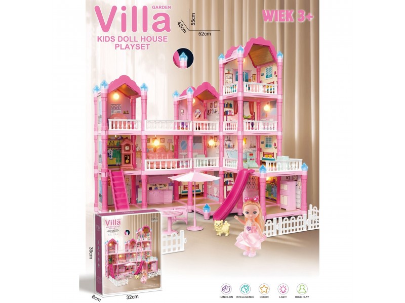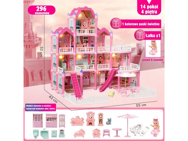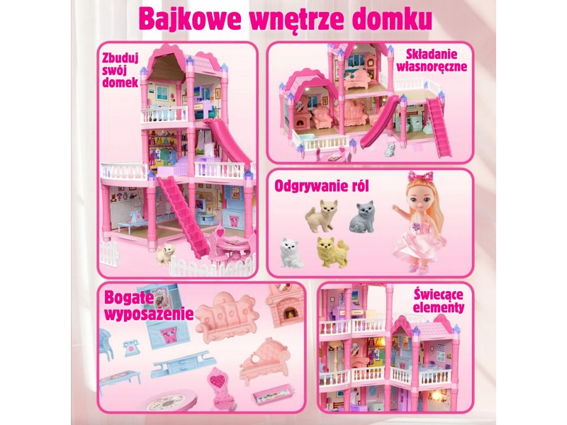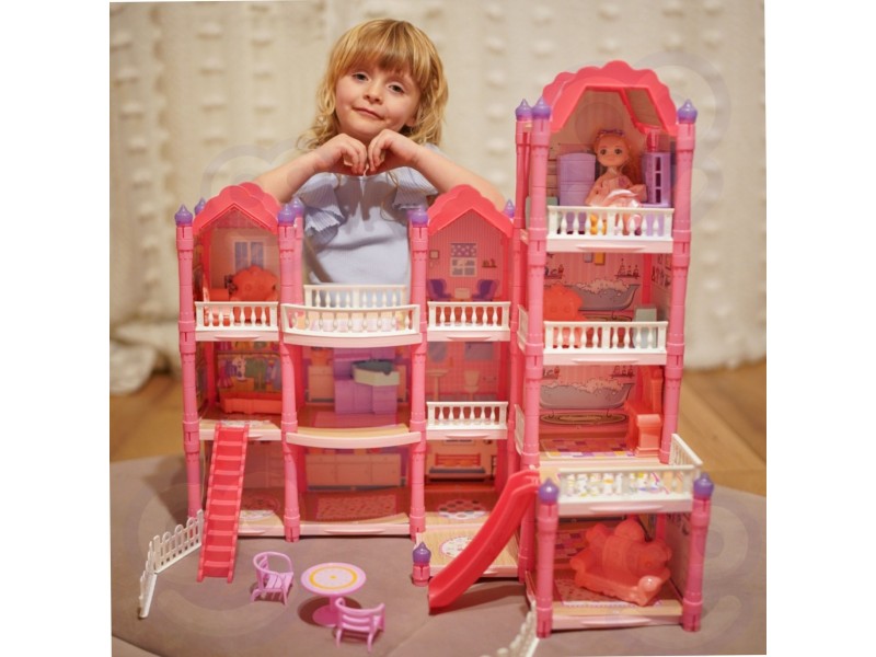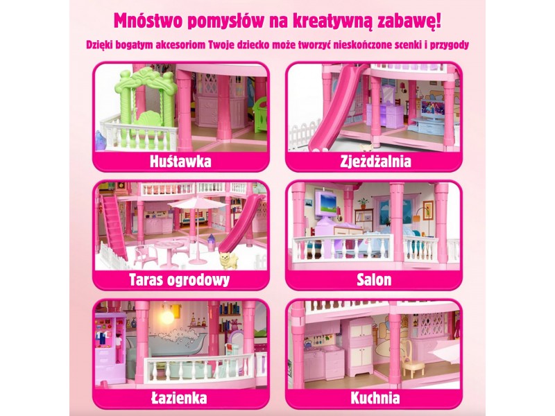 Poznaj wspaniały, trzypiętrowy domek dla lalek z różowym dachem, który stanie się ulubionym miejscem zabawy Twojego dziecka! Ta piękna willa o imponujących wymiarach została zaprojektowana z dbałością o każdy szczegół, co sprawia, że wygląda jak prawdziwy dom. Zestaw zawiera aż 296 elementów do złożenia, w tym bogate wyposażenie wnętrza i urocze mebelki, które pozwolą małej projektantce na samodzielne zaaranżowanie każdego z pomieszczeń. To idealna zabawka, która rozwija kreatywność, wyobraźnię oraz umiejętności manualne. W zestawie znajduje się wszystko, co potrzebne, aby stworzyć wymarzony dom dla lalek: od mebelków, przez akcesoria, aż po uroczą lalkę-mieszkankę. Zabawa w dom nigdy nie była tak realistyczna i wciągająca! Zjeżdżalnia, schody i taras to dodatkowe elementy, które urozmaicą zabawę i pozwolą na odgrywanie wielu scenariuszy. Dzięki solidnej konstrukcji domek zapewnia długie godziny fantastycznej i bezpiecznej zabawy.