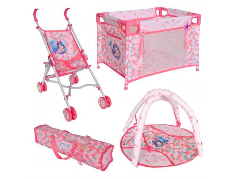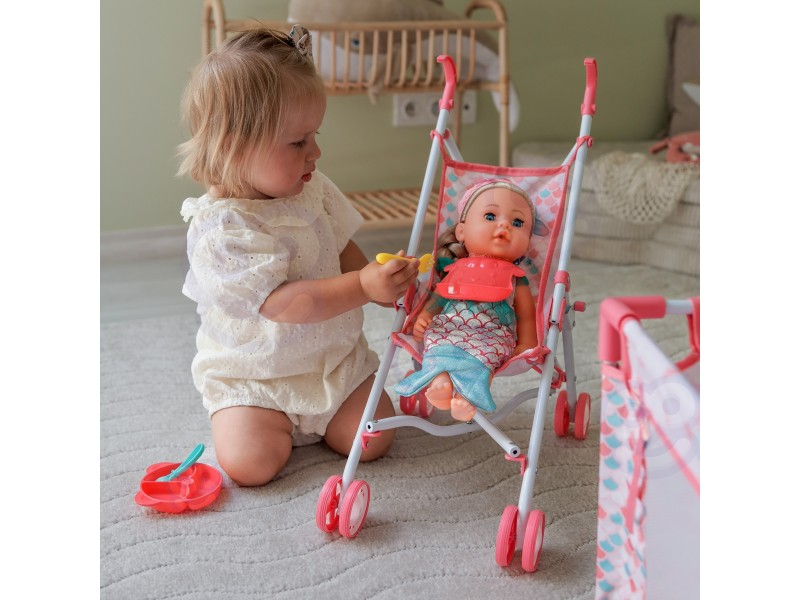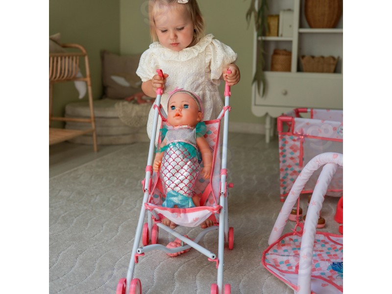 - - Wózek-parasolka – lekki, składany, w różowej kolorystyce z motywem syrenim.