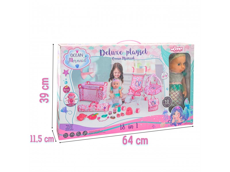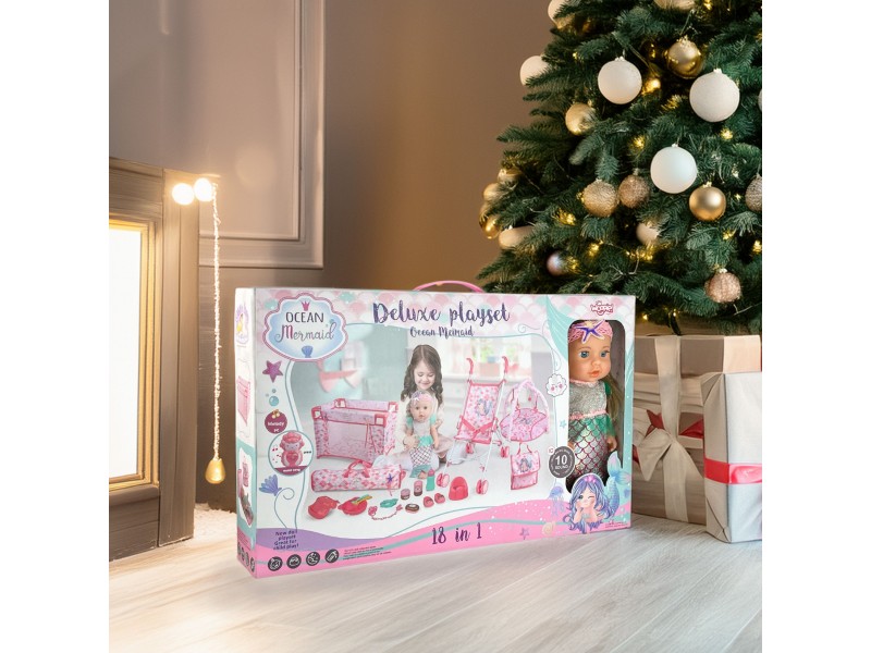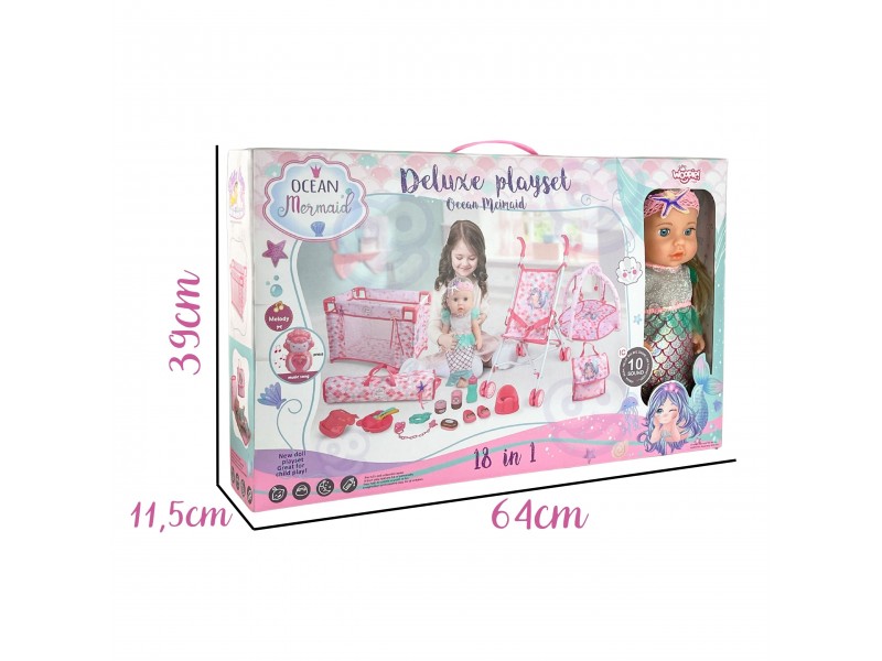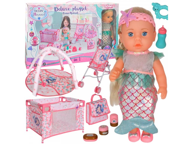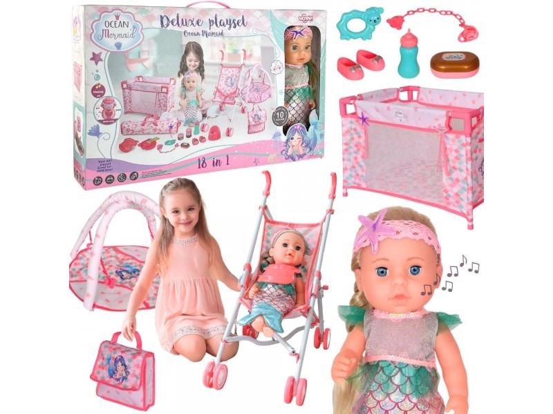 Odkryj bajkowy świat morskich przygód z wyjątkowym zestawem Deluxe Playset Ocean Mermaid 18 w 1! Ten bogaty komplet to gwarancja wielu godzin kreatywnej i radosnej zabawy. Największą atrakcją jest urocza Lalka Syrenka, która wydaje aż 10 różnych dźwięków, zachwycając każdą małą fankę oceanu. W komplecie znajdziesz wózek, łóżeczko, torby oraz liczne akcesoria, które pozwolą bawić się w opiekę i odgrywanie ról. To doskonały prezent, który wspiera rozwój wyobraźni, empatii i umiejętności społecznych dziecka!
