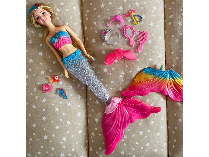 - - Lalka Syrenka z długimi blond włosami i kolorowym topem (różowo-niebieskim)