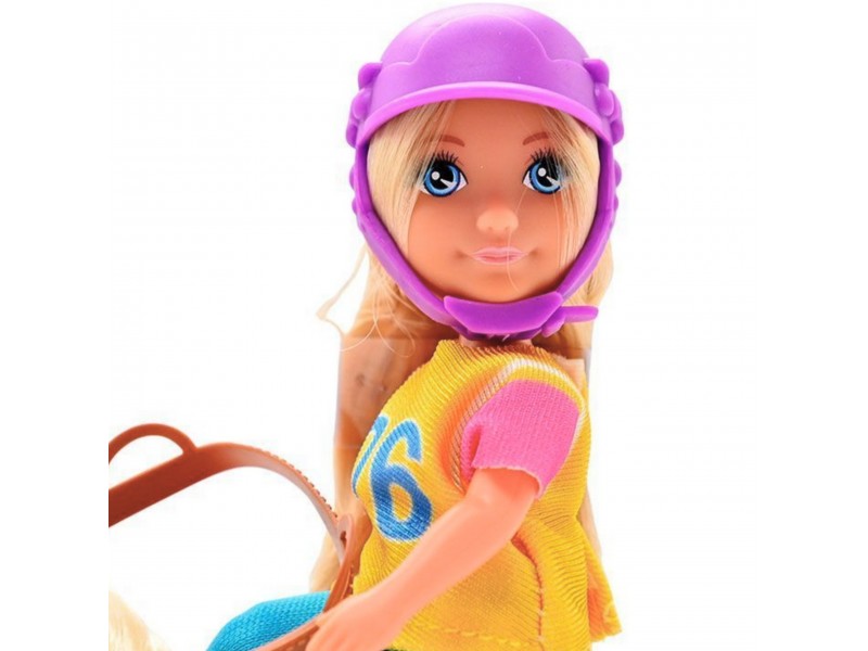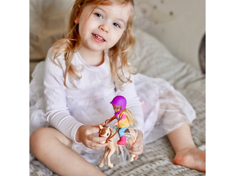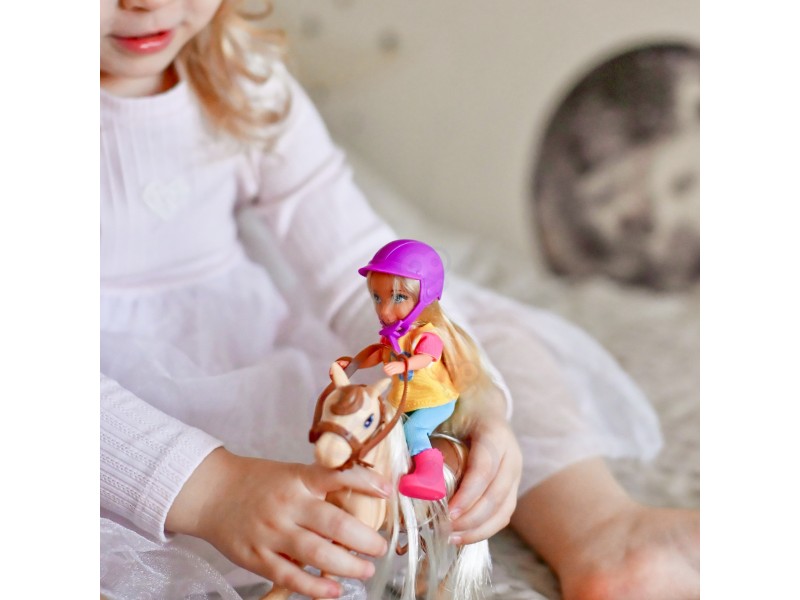 - - Lalka osadzona na koniu, z widocznym siodłem i uzdą, co zachęca do odgrywania realistycznych scenek.