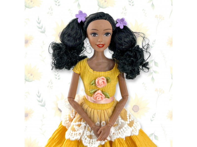 - Włosy: Czarne, kręcone, ozdobione żółtymi akcesoriami