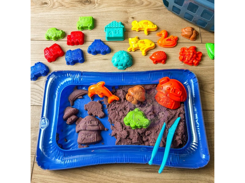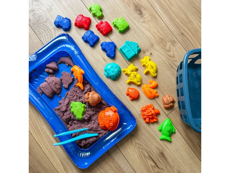 - - Duży wybór foremek (m.in. zwierzęta: słoń, delfin, aligator, ryba; pojazdy: samochód, pociąg; budynki: dom, grzyb)
