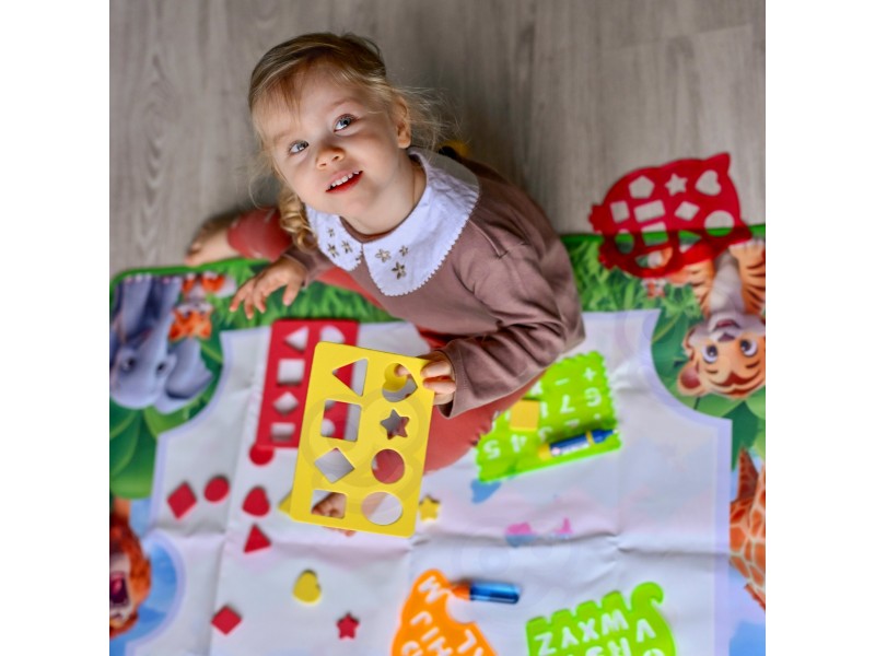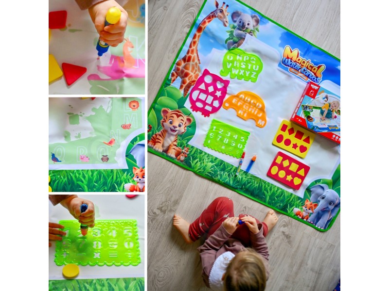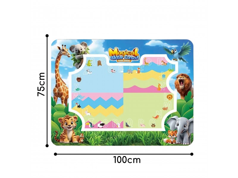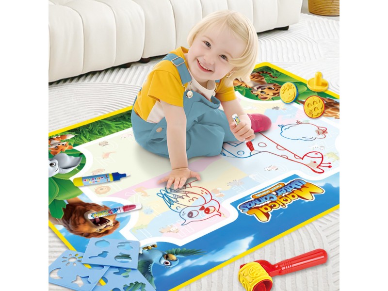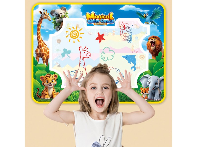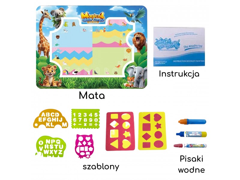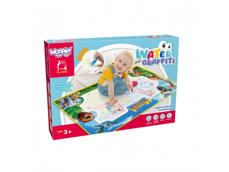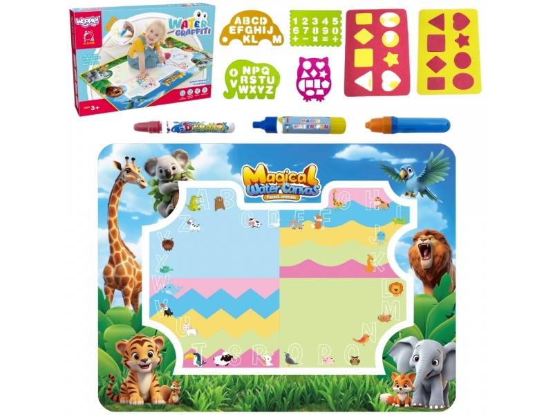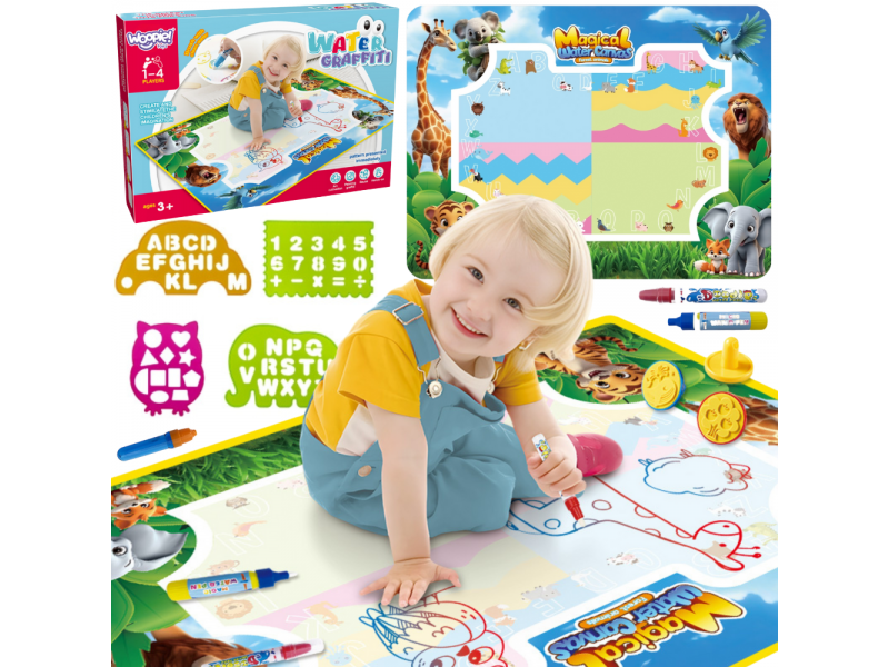 Mata do Malowania Wodą marki WOOPIE to edukacyjny zestaw artystyczny dla dzieci od 3 roku życia. Wystarczy napełnić dołączone pisaki/pędzelki czystą wodą, by odkrywać kolory, litery, liczby i kształty bez użycia tuszu i farb. Rysunki pojawiają się na chwilę, a po wyschnięciu znikają, zapraszając do kolejnej zabawy. Duży format 100×75 cm daje miejsce do wspólnego tworzenia, a wesoła grafika zwierząt z dżungli zachęca do nauki przez zabawę.
