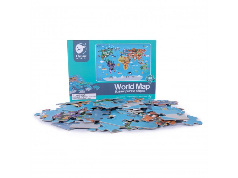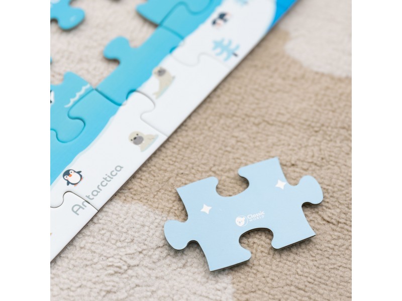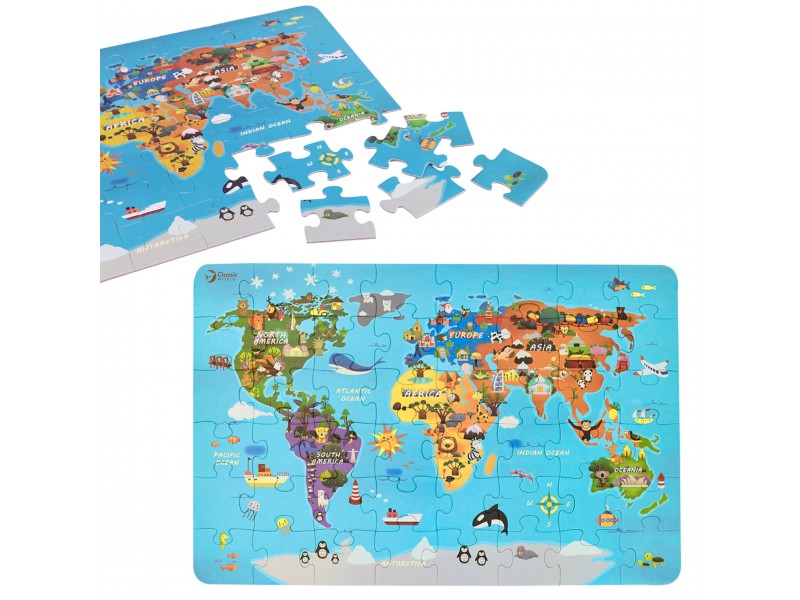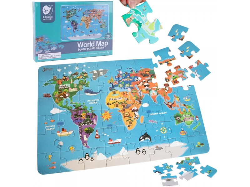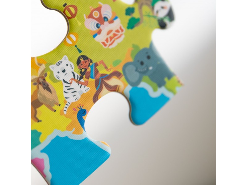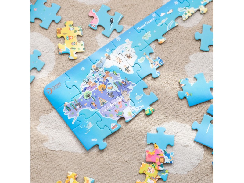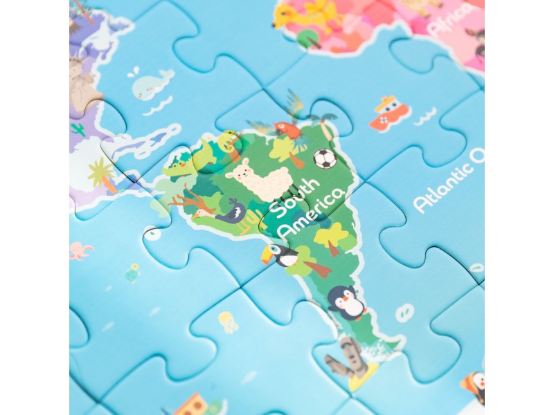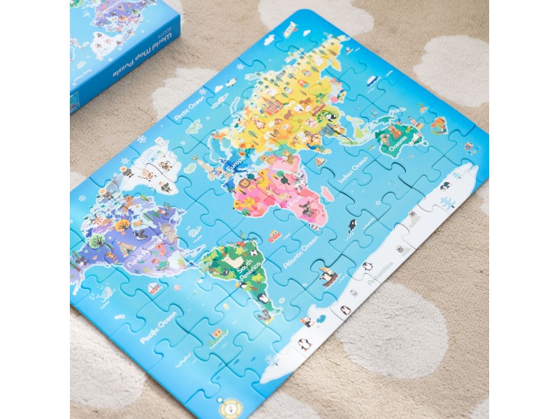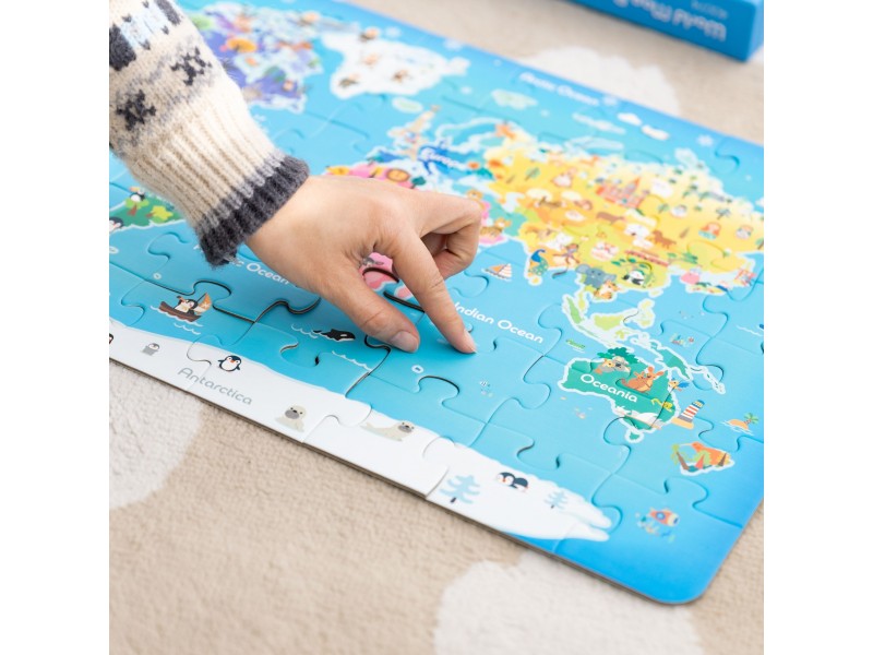 Kolorowe puzzle przedstawiające mapę świata rozwijają zdolności obserwacji, umiejętności manualne, wyobraźnię i wiedzę geograficzną. Dziecko poznaje kontynenty, oceany i różnorodność naszego globu w ciekawy i interaktywny sposób.