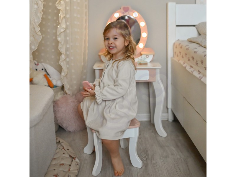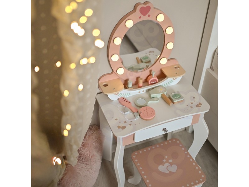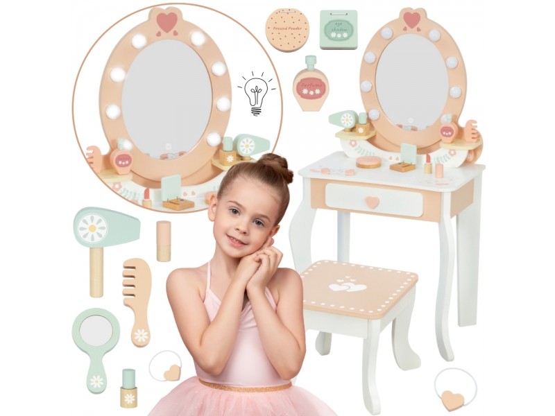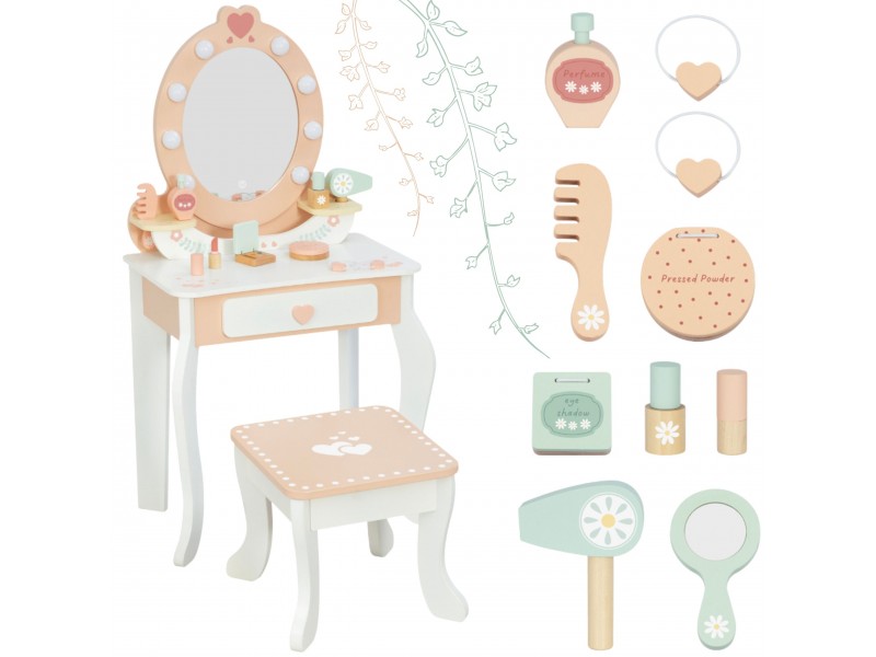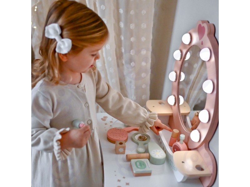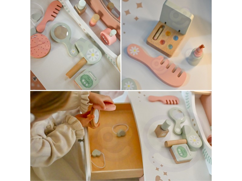 Każda dziewczynka marzy o swoim magicznym kąciku, gdzie może czuć się piękna i wyjątkowa. Oto doskonała odpowiedź toaletka marki Tooky Toy ze skompletowanym zestawem akcesoriów, która inspiruje do pierwszych eksperymentów z opieką o siebie. Wykonana z naturalnego drewna w delikatnych pastelach, stwarza spokojną atmosferę zabawy bez zbędnych frywolności. Lustro w drewnianej ramie, pełen zestaw kosmetyczek i narzędzi do stylizacji, wszystko przygotowane do chwili, gdy wyobraźnia dziecka rusza w drogę