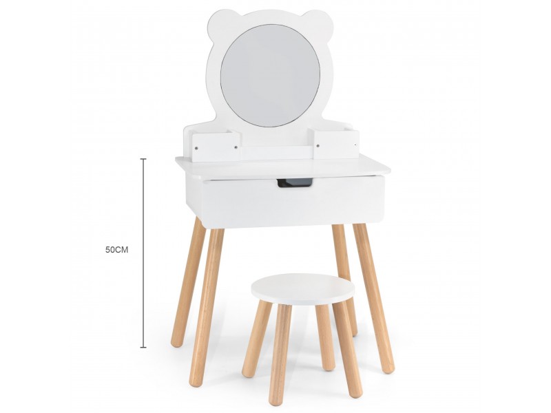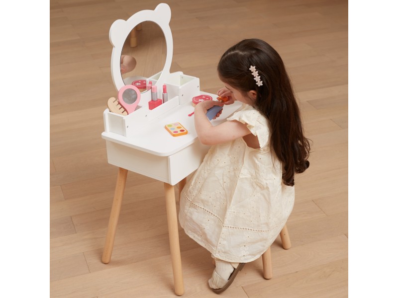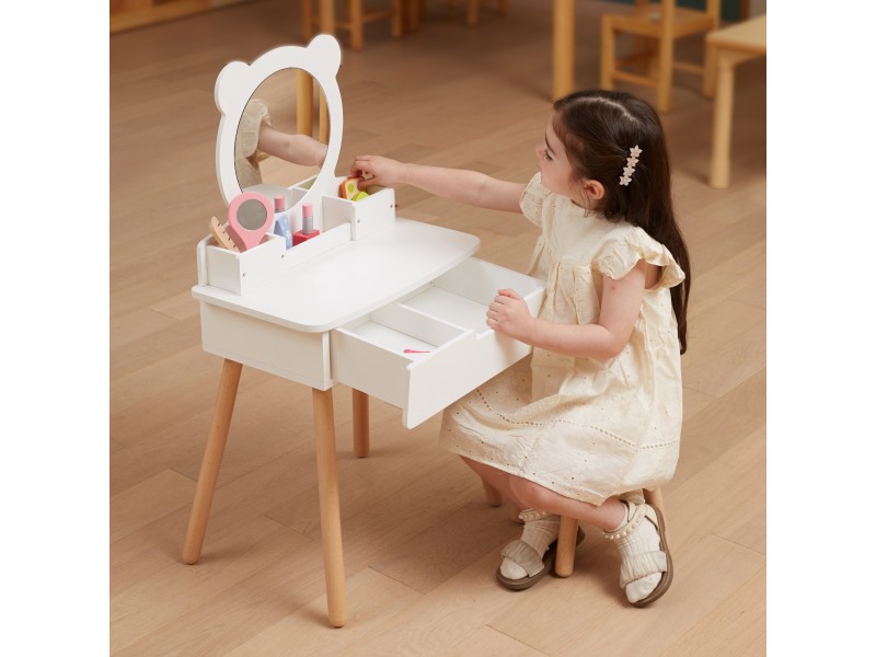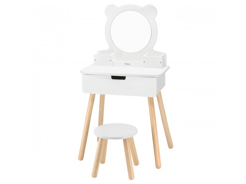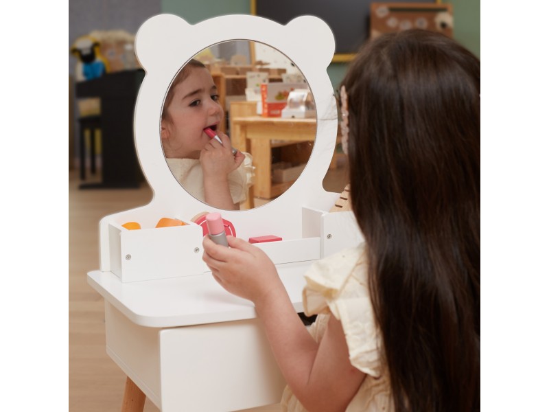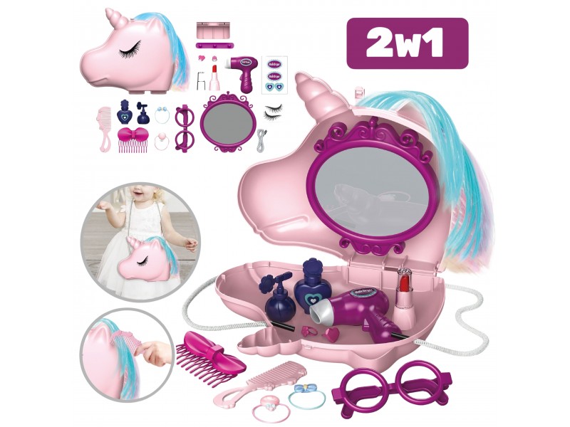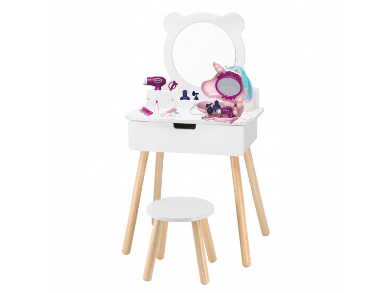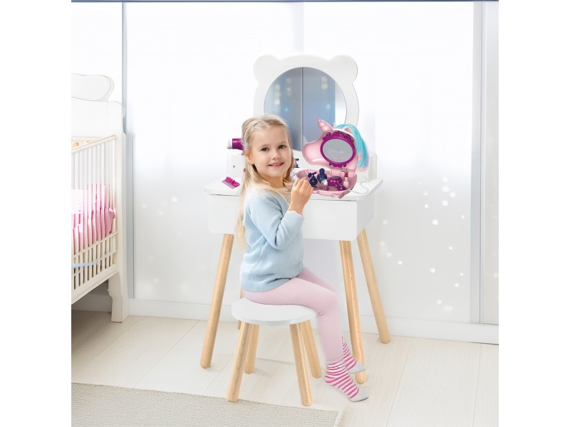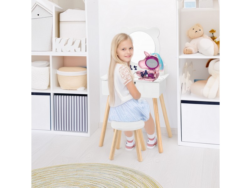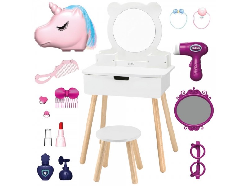 Duża, wolnostojąca biała toaletka + zestaw akcesoriów w pięknej torbie jednorożca od marki Viga to wymarzony komplet w pokoju każdej dziewczynki. Toaletka posiada wysuwaną szufladę, w której mała księżniczka może schować swoje skarby. Pod samym lustrem znajdują się przegródki na poręczne akcesoria. W zestawie znajdziemy również krzesełko do toaletki. W torebce jednorożca, znajdują się wszystkie niezbędne akcesoria jak z salonu piękności.
