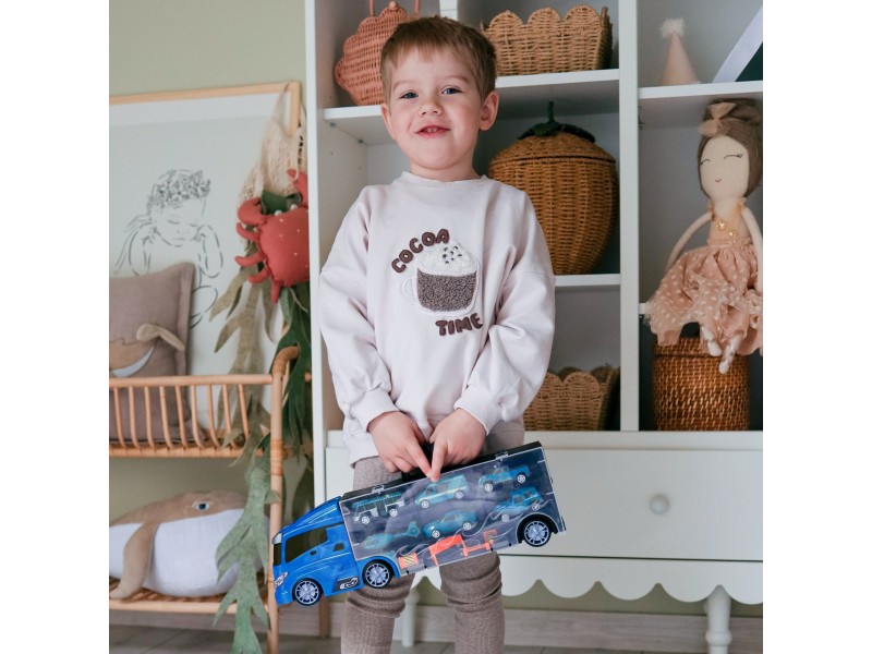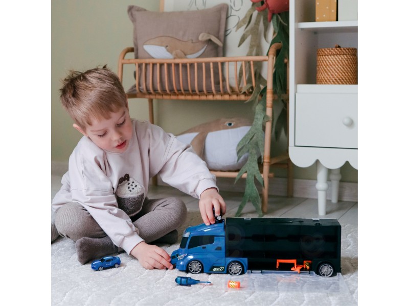 Ciężarówka 3w1 Policja od marki WOOPIE To idealna zabawka dla każdego małego fana pojazdów Policji, transportu i akcji! Zestaw składa się z dużej lawety TIR, która pomieści w sobie aż 4 samochody Policyjne, helikopter oraz dodatkowe znaki ostrzegawcze, które dodają realizmu zabawie. Dzięki wyrzutni umieszczonej na lawetcie, dzieci mogą wysunąć samochody i wystrzeliwać je na różne odległości. Laweta ma aż 40 cm długości, co sprawia, że jest wystarczająco duża, by pomieścić wszystkie pojazdy i akcesoria. Zestaw doskonale rozwija wyobraźnię dziecka, pomagając w tworzeniu własnych scenariuszy zabawy. Dzięki znakom ostrzegawczym mogą uczyć się podstaw bezpieczeństwa na drodze, co czyni zabawę zarówno edukacyjną, jak i pełną emocji.