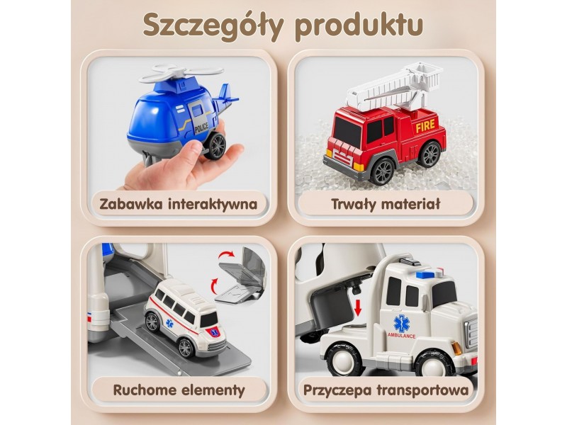 Duży Zestaw Ratunkowy Ciężarówka+4 Auta od Marki Woopie Zaprojektowana z myślą o małych pasjonatach straży pożarnej, policji,pogotowia ta zabawka 5 w 1 to idealny zestaw dla każdego małego ratownika! Naciśnij przycisk na górze kabiny ciężarówki, aby zobaczyć jasne migające światła i usłyszeć realistyczne syreny, bardzo atrakcyjne dla dzieci. Zestaw zawiera dużą ciężarówkę transportową oraz cztery pojazdy ratunkowe: samochód strażacki, radiowóz, helikopter policyjny, karete. Każdy z pojazdów ma ruchome elementy, które pozwolą Twojemu dziecku poczuć się jak prawdziwy bohater podczas akcji ratunkowych! Zestaw jest świetnym pomysłem na prezent urodzinowy, świąteczny czy na inne okazje.