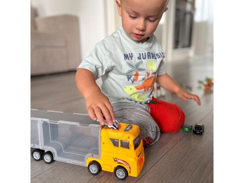 - - W zestawie znajdują się małe samochodziki, które można przewozić w transporterze, dodając więcej możliwości zabawy