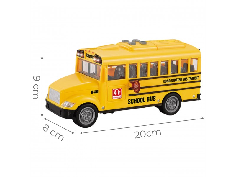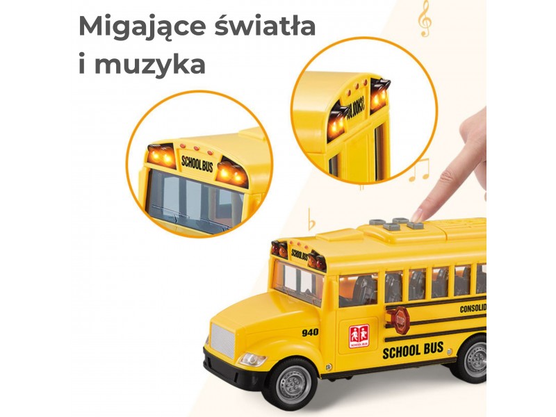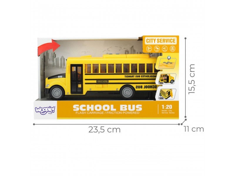 Zabierz swoje dziecko w fascynującą podróż do szkoły dzięki temu realistycznemu, interaktywnemu autobusowi szkolnemu! Zabawkowy autobus szkolny marki WOOPIE to idealna propozycja dla małych miłośników motoryzacji i transportu miejskiego. Realistyczne detale, dźwięki, światła oraz możliwość otwierania drzwi zapewniają mnóstwo frajdy i wspierają rozwój wyobraźni dziecka. Pojazd posiada wiele wbudowanych funkcji, które nie pozwolą się nudzić. Wyposażony jest w różne efekty dźwiękowe, przednie światła oraz otwierane drzwi przednie i tylne. Zabawka posiada cztery gumowe koła oraz napęd frykcyjny. Wystarczy ją pchnąć do przodu lub do tyłu i sama przejedzie nawet klika metrów.