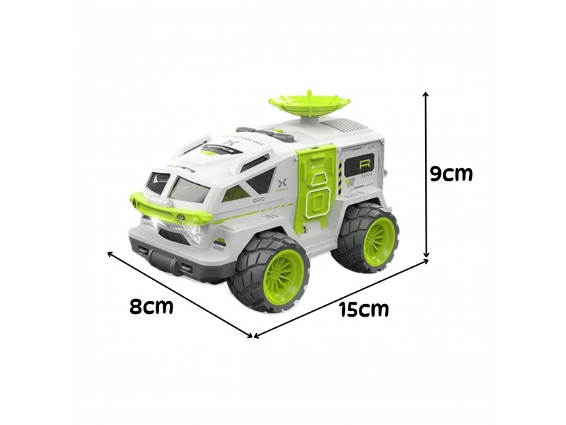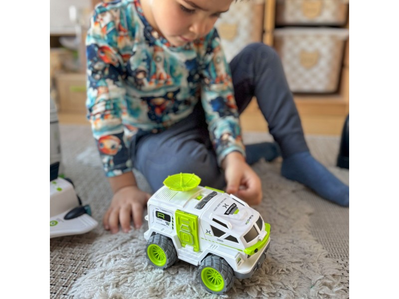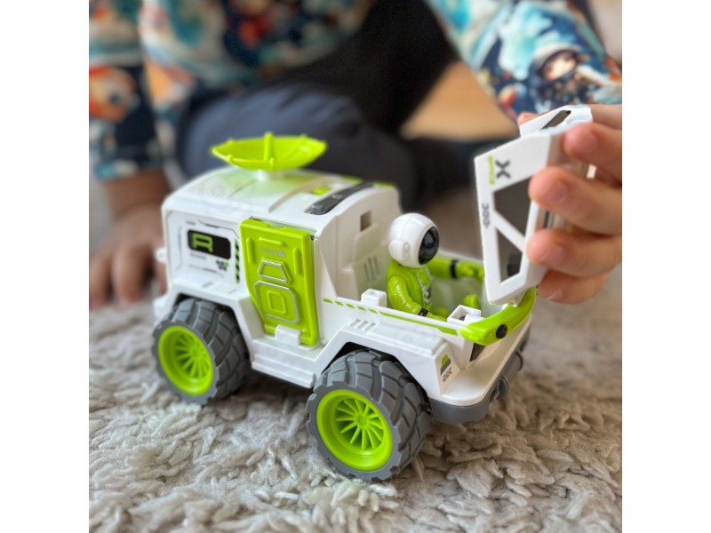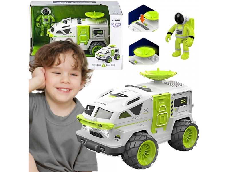Pozwól dziecku wkroczyć w fascynujący świat międzygwiezdnych podróży z Dużym Łazikiem kosmicznym marki Woopie – to nie tylko zabawka, ale prawdziwe centrum dowodzenia każdej dziecięcej misji kosmicznej! Ten niezwykle szczegółowo zaprojektowany pojazd przeniesie małych odkrywców wprost na powierzchnię obcej planety, gdzie mogą zbierać dane, badać teren i kontaktować się z bazą dzięki realistycznym elementom, takim jak obracający się radar, otwierana szyba czołowa czy interaktywne światła i dźwięki. Zaprojektowany z myślą o bezpiecznej i kreatywnej zabawie, pojazd został wykonany z trwałego tworzywa ABS, które zapewnia odporność na uderzenia i intensywną eksploatację przez małe rączki. Szerokie, gumowane koła o terenowym bieżniku pozwalają przemierzać każdy pokój, ogród czy plac zabaw, nadając zabawie zupełnie nowy wymiar. Naciśnięcie przycisku uruchamia efekty świetlne i dźwiękowe, dzięki którym dzieci mogą poczuć się jak prawdziwi astronauci w trakcie niebezpiecznej misji eksploracyjnej. Co więcej, obrót kół pojazdu automatycznie wprawia w ruch talerz satelity umieszczony na dachu – to mechaniczne rozwiązanie zachwyca dzieci i rozwija ich ciekawość działania urządzeń. Przednie światła pojazdu doświetlą zacienioną przestrzeń. W zestawie znajduje się również zielona figurka astronauty, która idealnie mieści się w kokpicie pojazdu. Ta zabawka to znakomite narzędzie do wspierania rozwoju wyobraźni, zdolności poznawczych i zainteresowań naukowych – a wszystko to przez beztroską, kreatywną zabawę!
