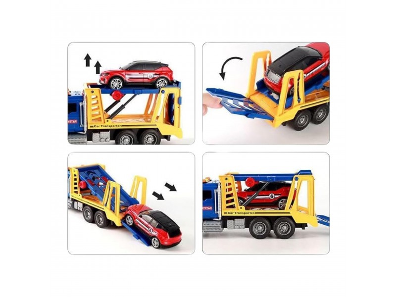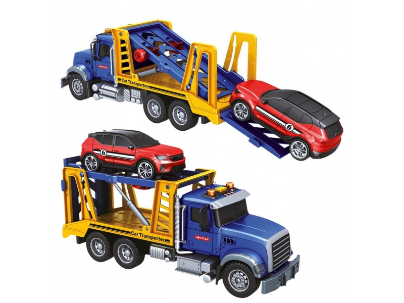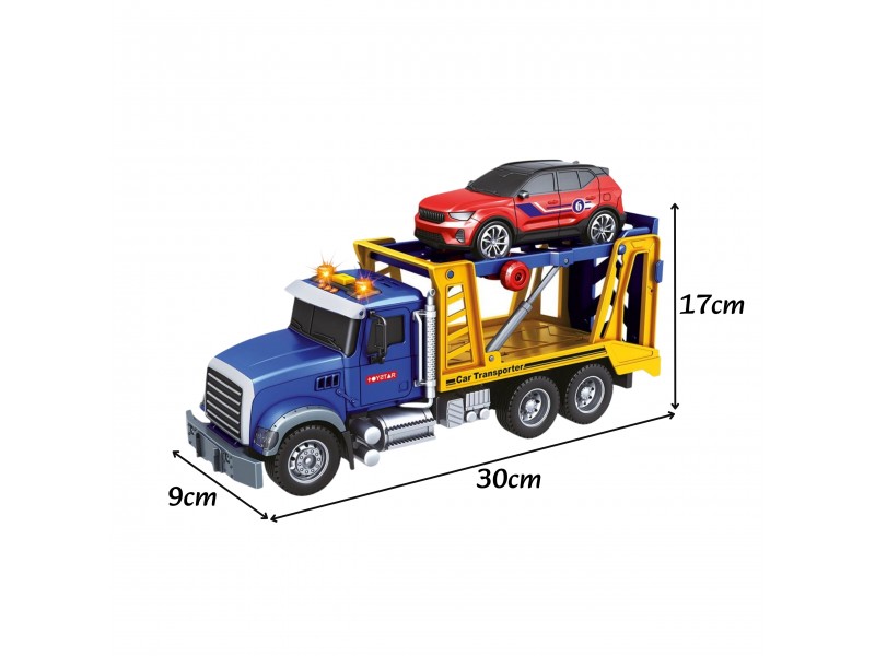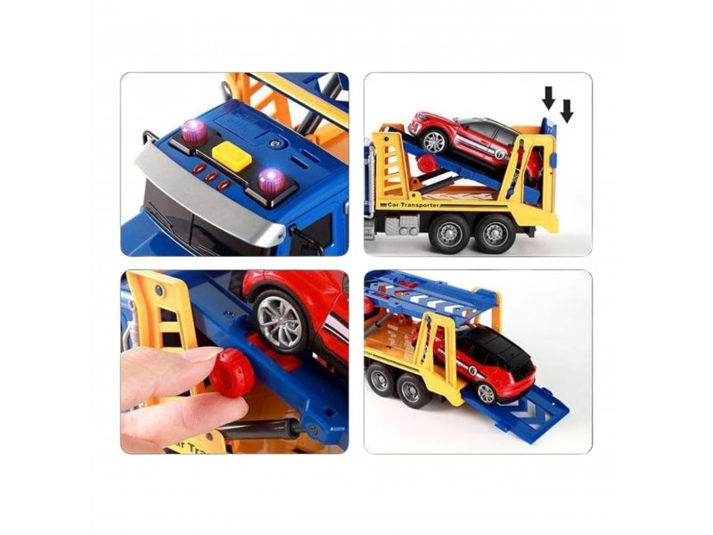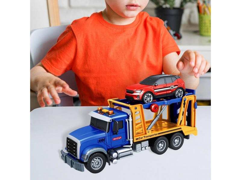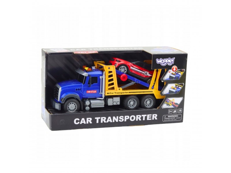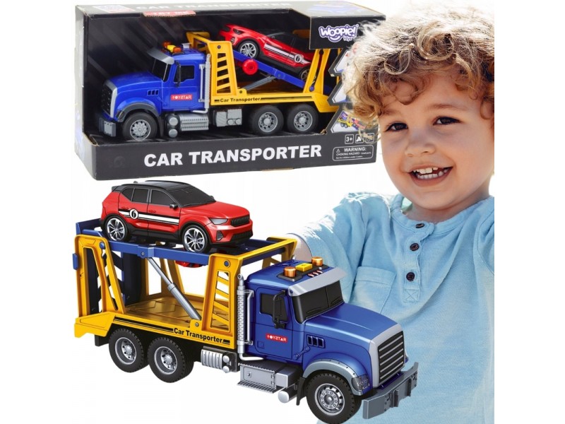 Duża Laweta Ciężarówka Car Transporter to fantastyczna zabawka dla każdego małego fana motoryzacji i wielkich pojazdów. Ta imponująca ciężarówka w kolorze niebieskim, z żółto-niebieską platformą, wyposażona jest w realistyczne efekty świetlne i dźwiękowe, uruchamiane przyciskami na kabinie. Gwarantuje to realistyczne wrażenia podczas zabawy! Laweta posiada ruchomą platformę, która może być opuszczana i podnoszona, co pozwala na załadowanie dołączonego do zestawu autka. To idealna zabawka do odgrywania scenek z życia kierowcy tira i rozwijania wyobraźni oraz małej motoryki. Produkt jest solidnie wykonany, co zapewnia długie godziny zabawy.