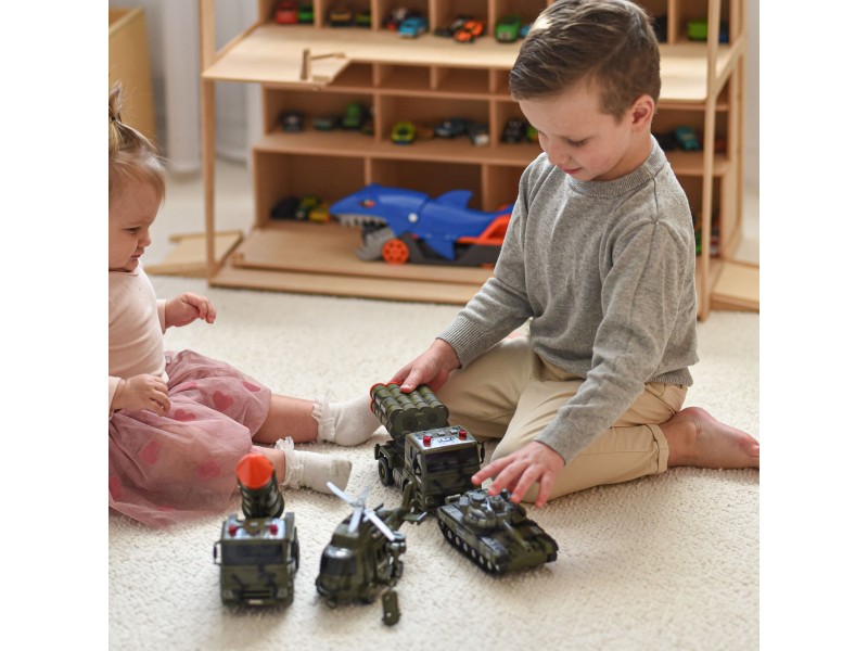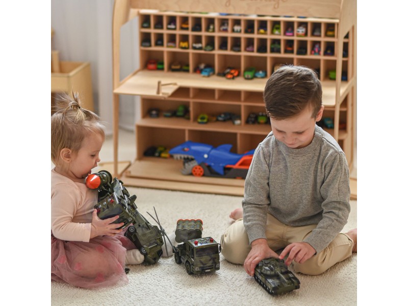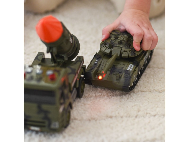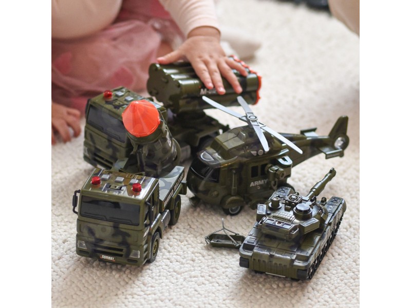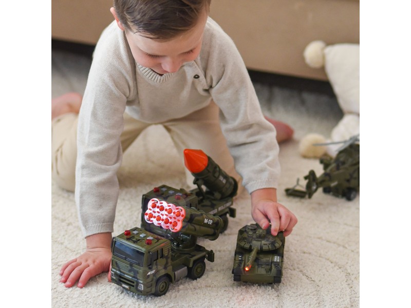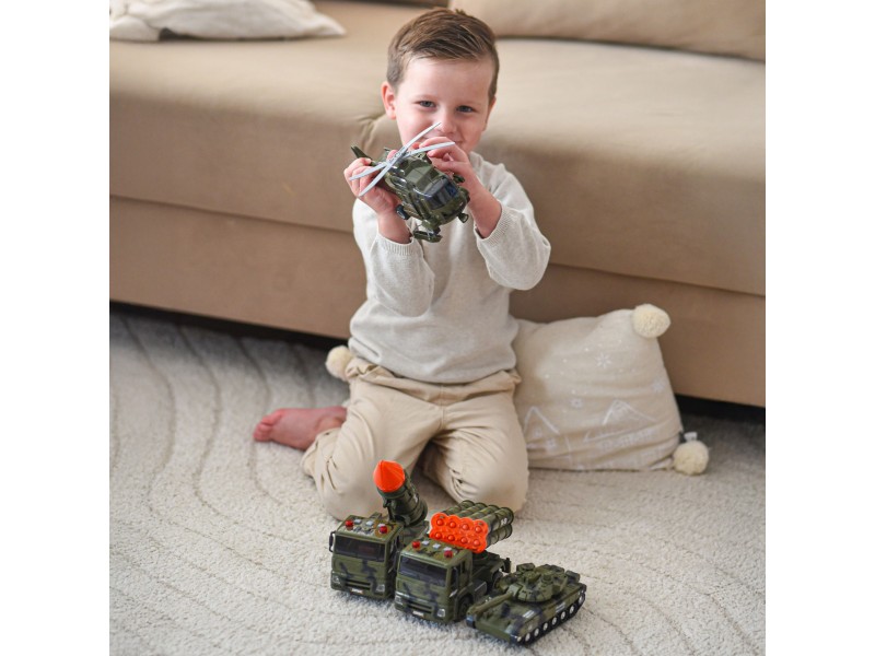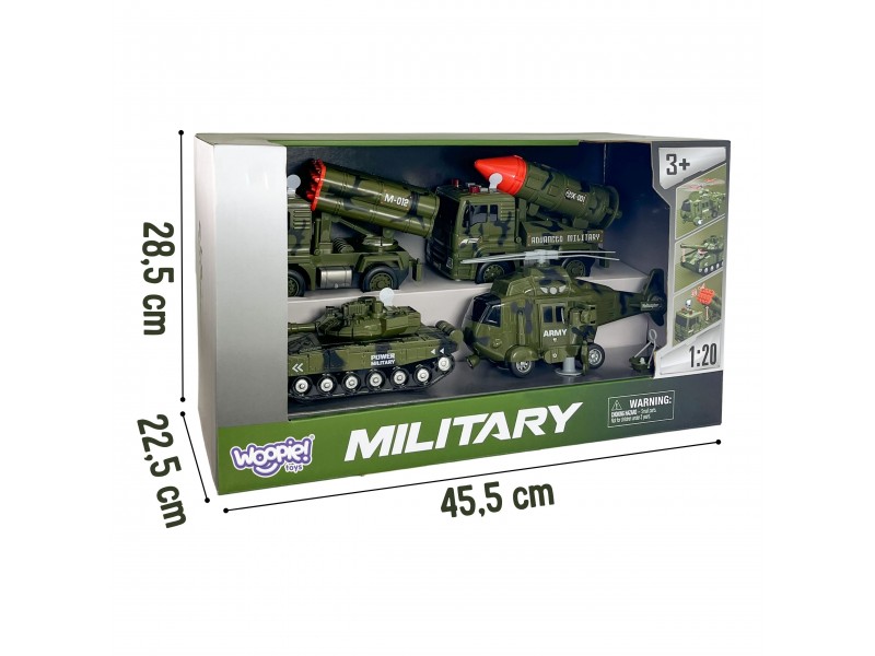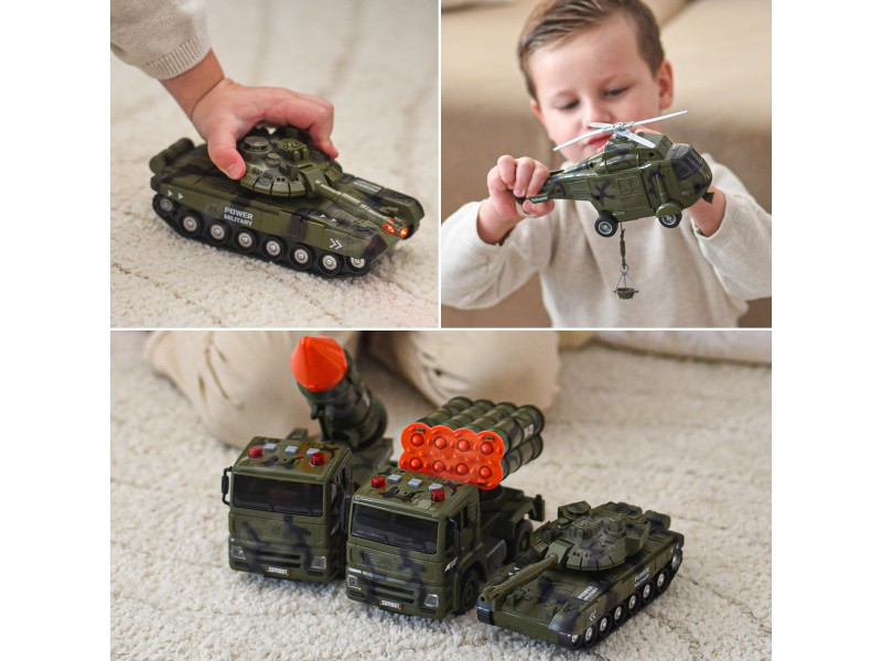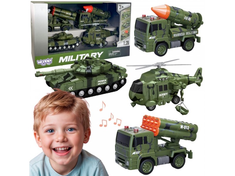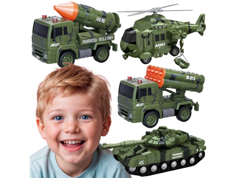 Kompletny zestaw wojskowych pojazdów armijnych od marki Woopie to idealna propozycja dla każdego małego fana militariów i akcji! Ten 4-częściowy zestaw zawiera realistyczne modele maszyn, takie jak czołg, helikopter oraz dwie potężne ciężarówki z wyrzutniami rakiet. Ciężarówki zostały wyposażone w efekty świetlne i dźwiękowe, co sprawia, że zabawa staje się niezwykle dynamiczna i wciągająca. Helikopter posiada ruchome śmigła oraz hak ratunkowy, inspirując do odgrywania misji ratunkowych. Zestaw rozwija wyobraźnię, kreatywność i doskonale nadaje się do zabawy w grupie. Zabawka przeznaczona dla dzieci od 3 roku życia.