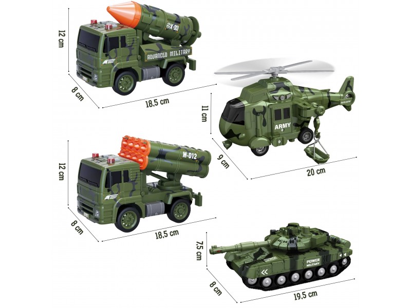 - Wymiary produktu - czołg: 19,5 x 8 x 7,5 (cm) helikopter: 20 x 9 x 11 (cm) auta z rakietami: 18,5 x 8 x 12 (cm)