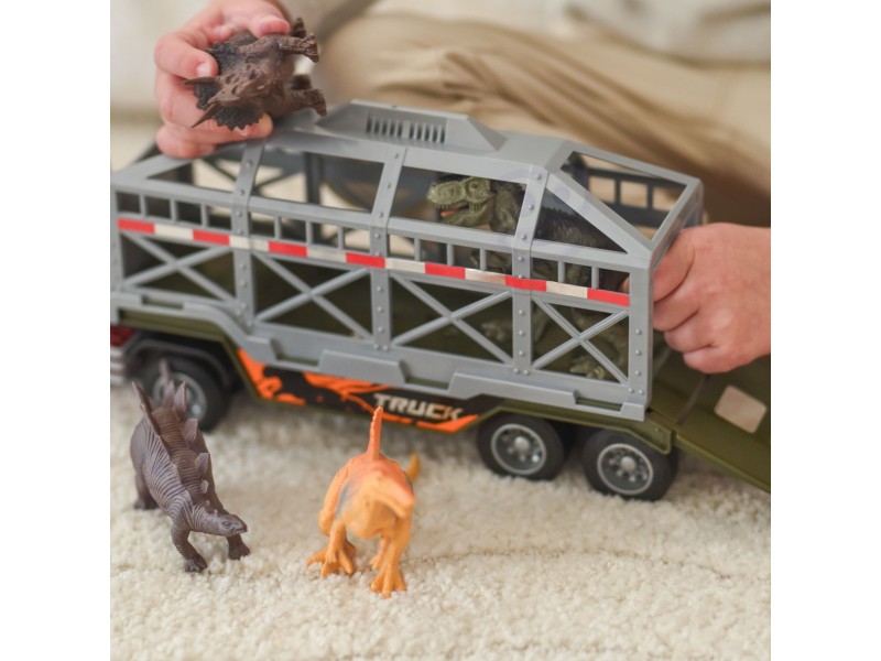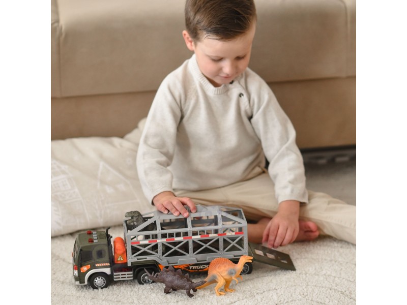 Ciężarówka Transporter Dinozaurów od marki WOOPIE to idealna propozycja dla każdego małego fana prehistorycznych stworzeń i motoryzacji. Ten imponujący zestaw łączy w sobie dużą ciężarówkę z lawetą oraz figurki dinozaurów, zapewniając wiele godzin kreatywnej zabawy. Pojazd wyposażony jest w napęd frykcyjny, dzięki czemu po popchnięciu sam jedzie do przodu. Atrakcyjność zabawy zwiększają efekty świetlne i dźwiękowe: na dachu kabiny znajdują się 4 przyciski uruchamiające odgłosy silnika, klakson, syrenę oraz dźwięki cofania, którym towarzyszą migające światła. Laweta posiada otwieraną klatkę oraz rozkładaną rampę, co pozwala na łatwy załadunek i rozładunek dinozaurów. Naczepę można również odczepić od ciągnika, co daje dodatkowe możliwości zabawy.