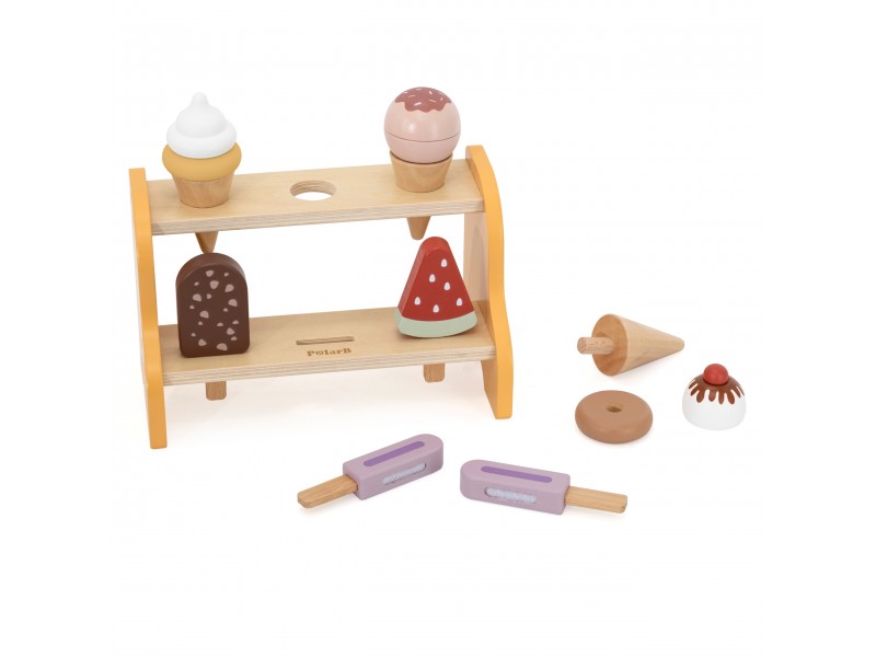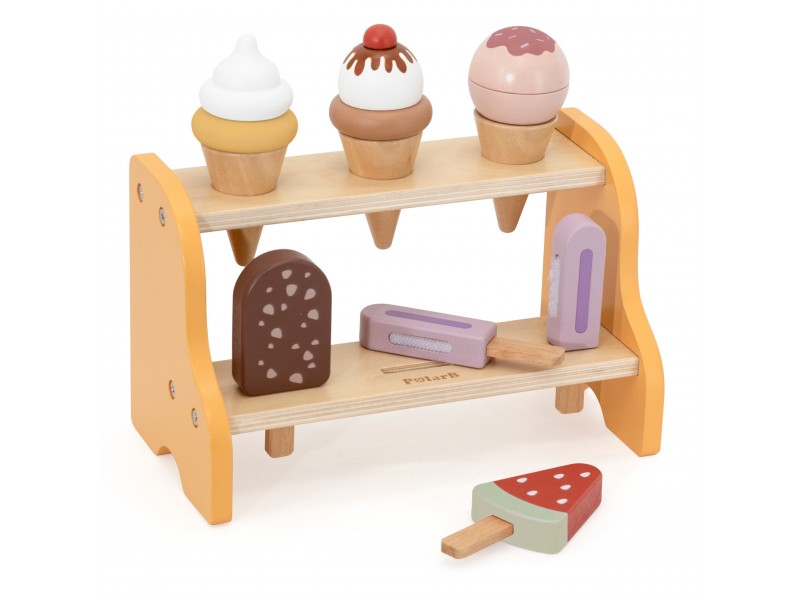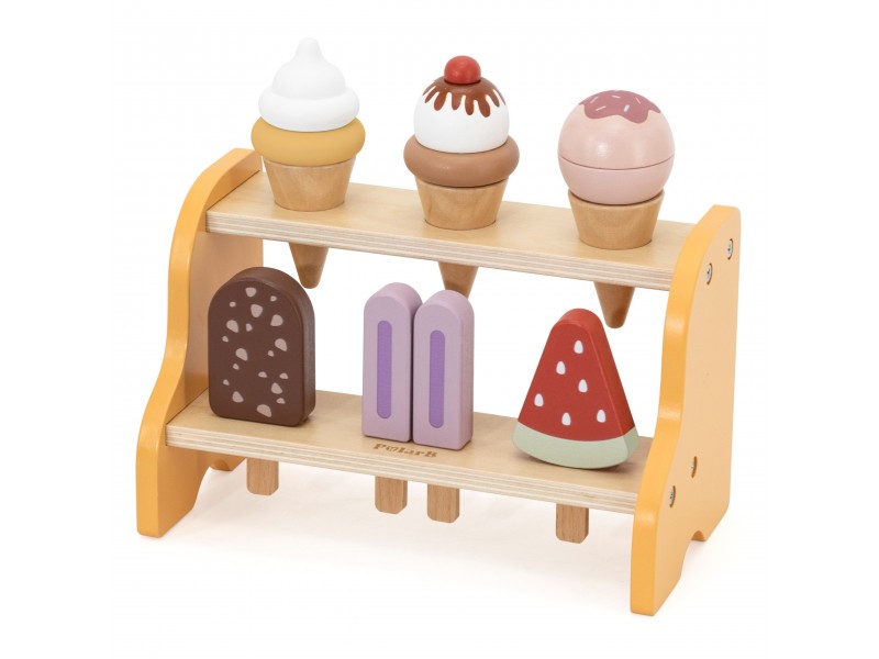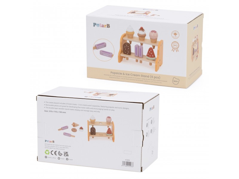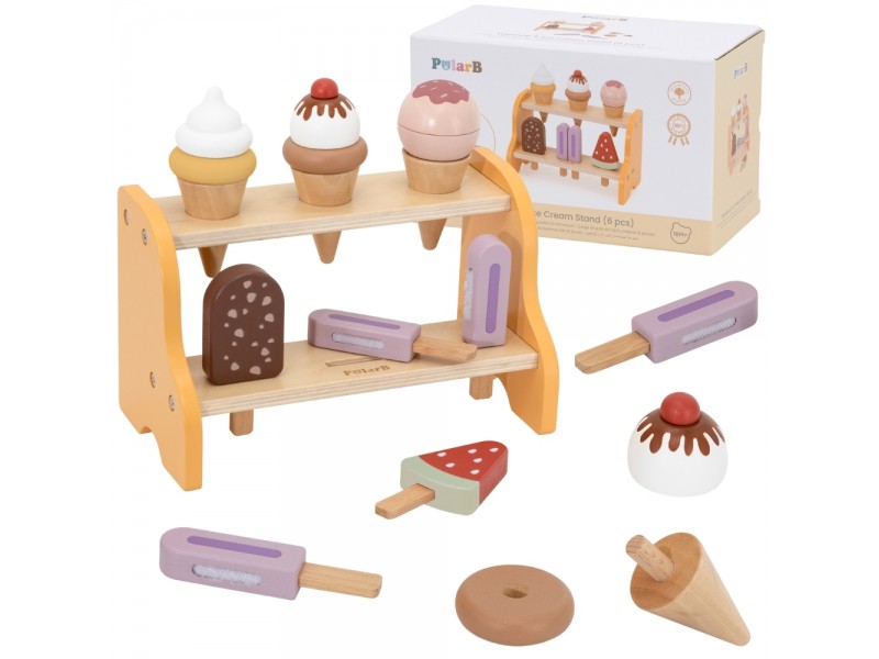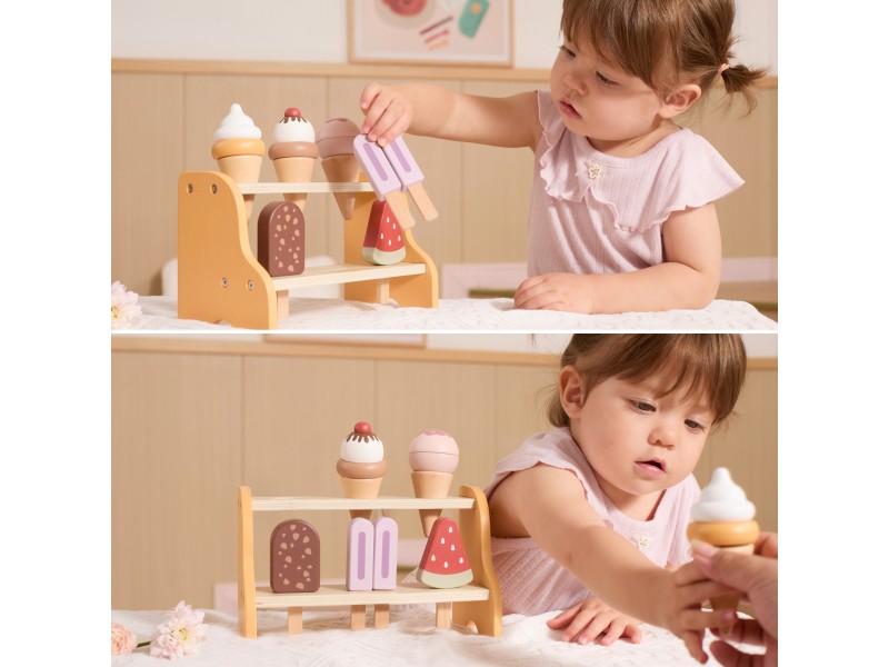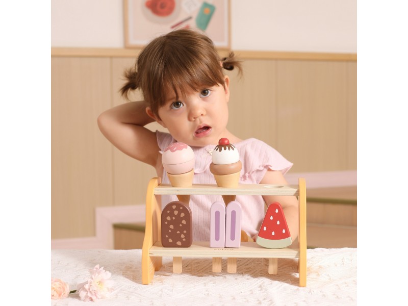 Ten uroczy zestaw zawiera 6 kolorowych lodów od marki VIGA– 3 rożki i 3 lody na patyku – ozdobione kultowymi wzorami, które zachwycą każde dziecko. Dwuwarstwowy, drewniany stojak pozwala eksponować lody i utrzymać porządek podczas zabawy. Wyjmowane elementy stymulują małą motorykę i rozwijają zabawę dotykową. Idealny do kreatywnego odgrywania ról – np. własnego straganu z lodami!