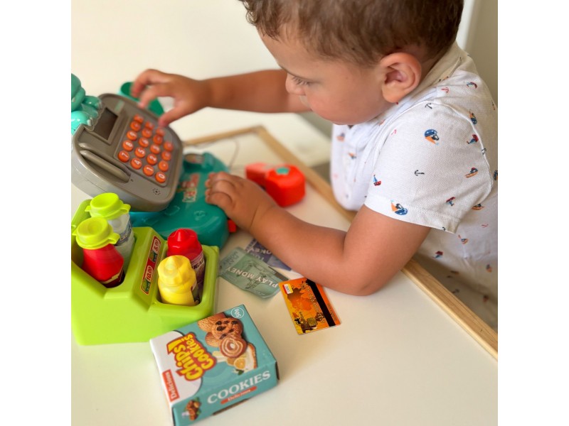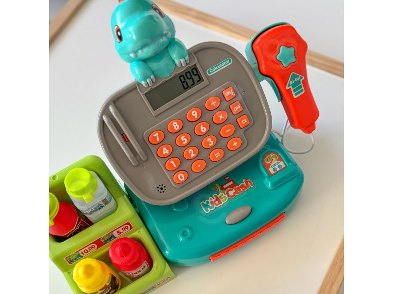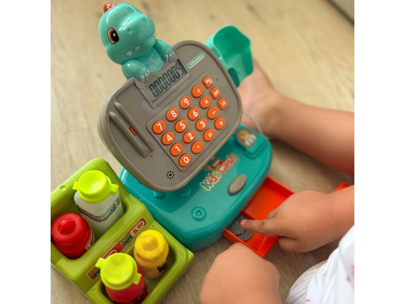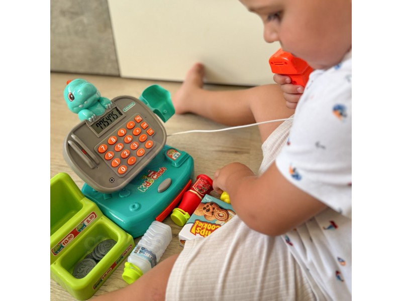 Kasa sklepowa Dino z Półką od marki WOOPIE to idealna propozycja zabaw. Dzieci mogą wybrać produkty, które chcą kupić, a następnie nabić je na kasę. Przy pomocy czytnika zeskanują ciasteczka i inne produkty. Następnie kupujący może zapłacić pieniążkami lub kartą płatniczą.
