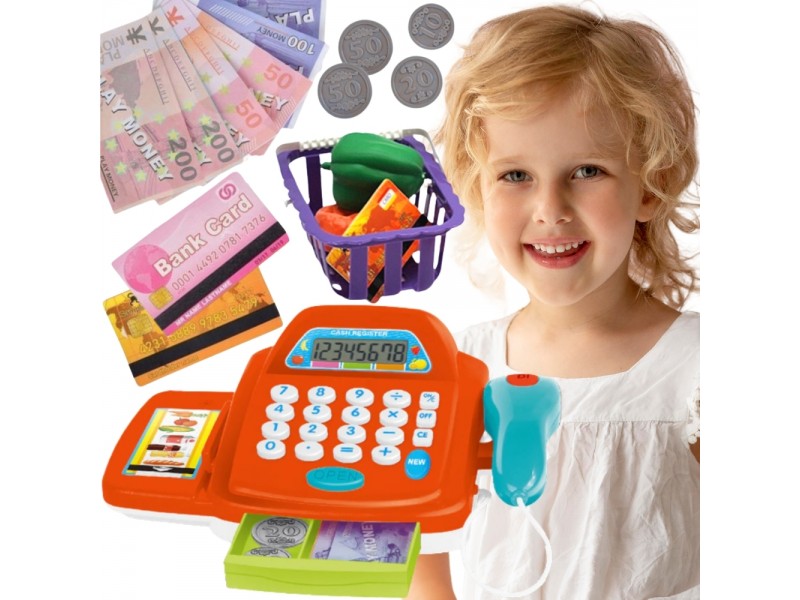 - - kasę sklepową z kalkulatorem i otwieraną kasetka na przechowywanie pieniążków,