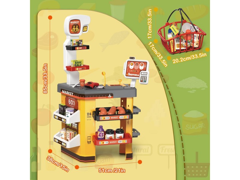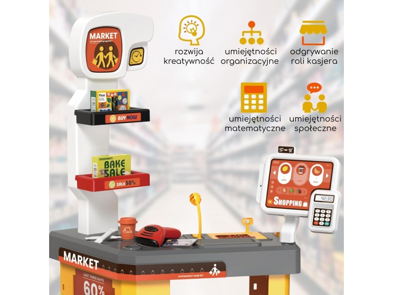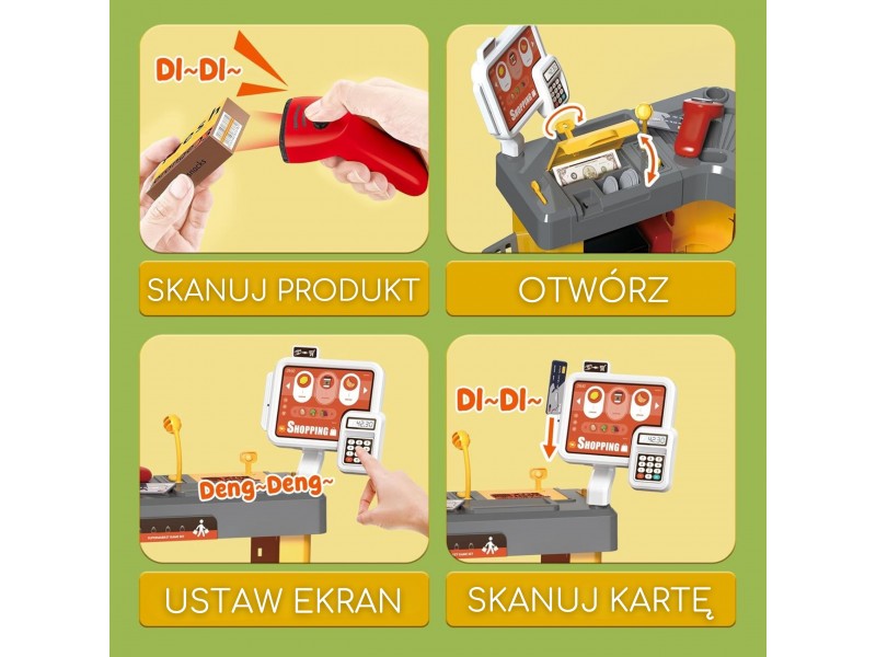 Nowoczesny Supermarket od marki WOOPIE sprawi, że twoje dziecko poczuje się jak za kasą prawdziwego sklepu! Dbałość o każdy szczegół zapewni BEZPIECZNĄ i wciągającą zabawę dla dzieci. Rozpocznij swoją ekscytującą podróż w świat handlu, używając skanera, który ożywia każdy zakup. Ta interaktywna zabawka nie tylko uczy, ale również dostarcza niezapomnianych chwil rozrywki. Dzięki kasie fiskalnej dziecko może odgrywać rolę kasjera, nabywając umiejętności matematyczne i rozwijając kreatywność.