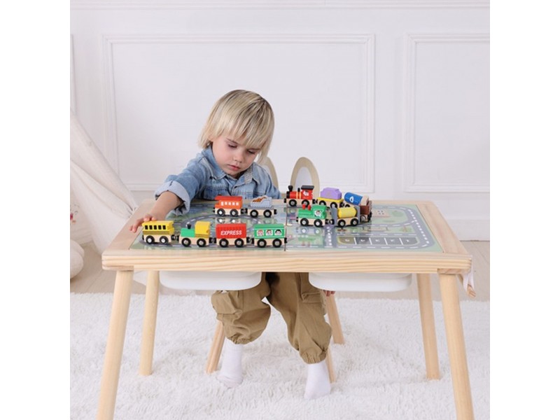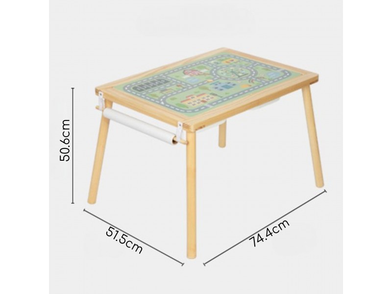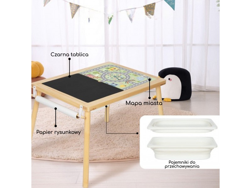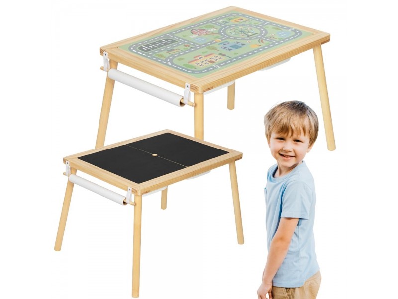 Drewniany stolik aktywności marki Woopie Green to idealne miejsce zabawy dla małego artysty i odkrywcy! Dzięki przemyślanej konstrukcji dziecko może rysować kredą na czarnej tablicy, bawić się autkami po mapie miasta, tworzyć rysunki na papierze w rolce lub swobodnie wykorzystać blat do układania klocków i zabaw kreatywnych. Solidne wykonanie z drewna oraz ergonomiczne wymiary sprawiają, że stolik idealnie dopasowuje się do potrzeb małych twórców w wieku przedszkolnym. To mebel, który nie tylko zapewnia godziny angażującej zabawy, ale także sprzyja rozwojowi wyobraźni i umiejętności manualnych.